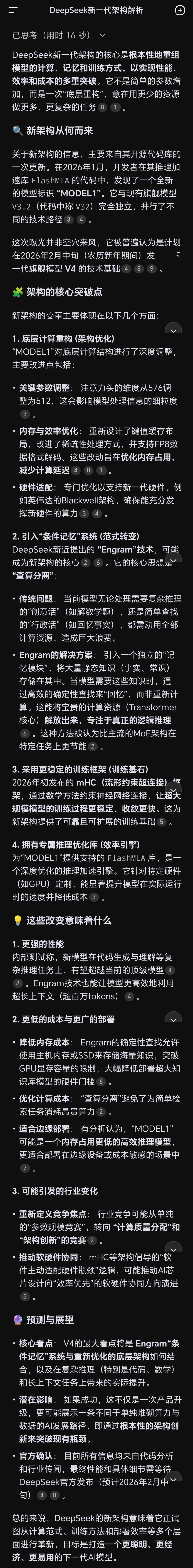 DeepSeek新架构意味着什么看看它自己是如何回答的,挺详细。总结起来就是,可能会有更聪明、更经济、更易用的新一代AI模型。今年各行各业在AI上面,也都会加大、加快进度。不知道回快到什么程度。
