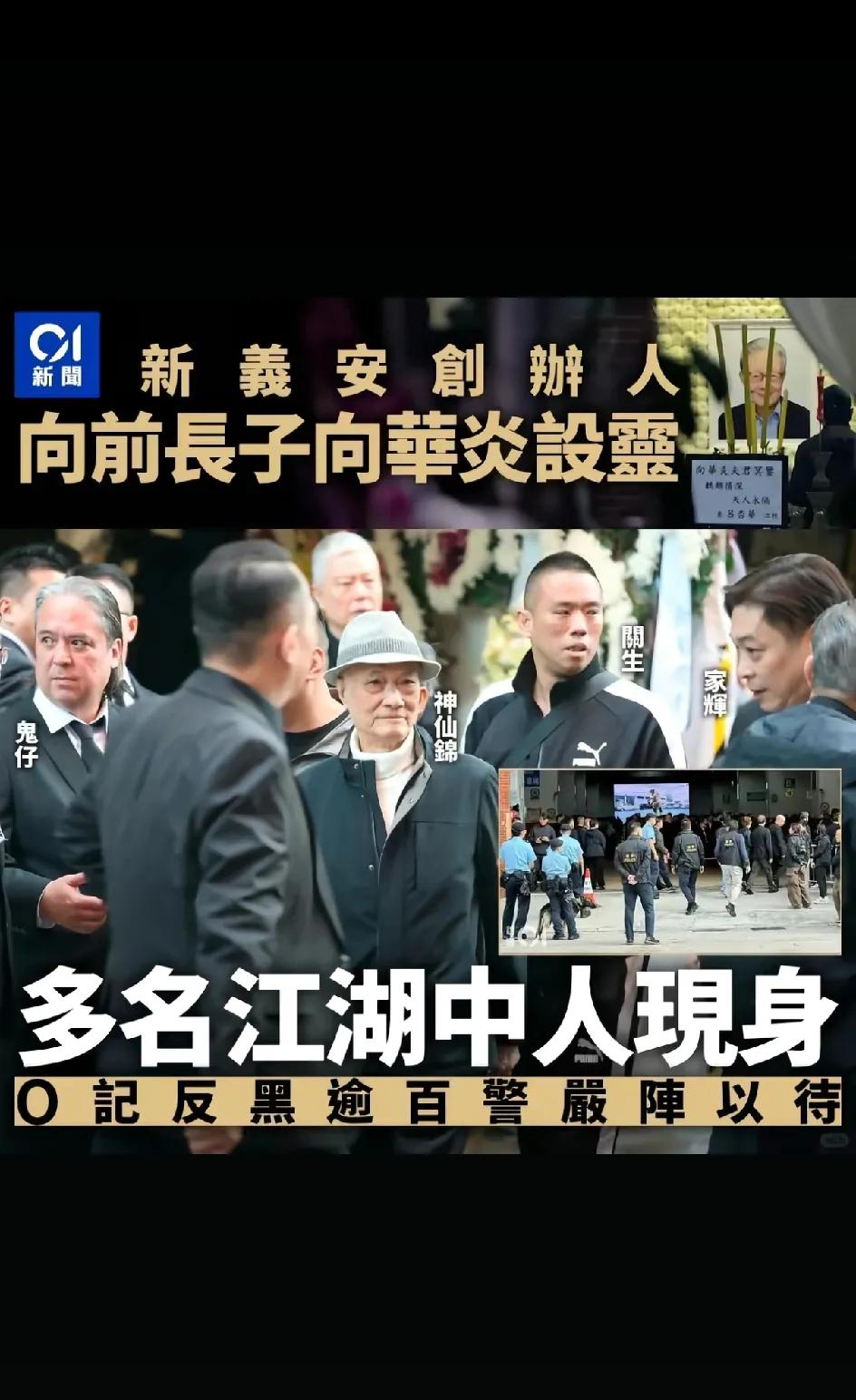新义安江湖大哥向华炎葬礼,香港娱乐圈、企业界、商界、各界人士来了好多人。百科上说他出生于1932年。讣告中说他今年97岁。 向华炎是向前的嫡长子。向前,戴笠的心腹,黑帮“新义安”的创始人。 向前有四个老婆,13个孩子,9个儿子,四个女儿。比较出名的是向华炎和向华强。 向华炎二十一岁承起父亲的“新义安”向华强、向华胜能在香港影坛做大、做强、绝对离不开大哥向华炎的帮助。 向华强说:我是富二代的名,过的是穷二代的生活,爸爸很早就离开我们了。 向华强说小时候上学的年纪,他以为大哥就是他的爸爸。学校要家长签字,他妈妈不会写字,都是大哥签字的。现在大哥走了,他心里一定很难受吧!
