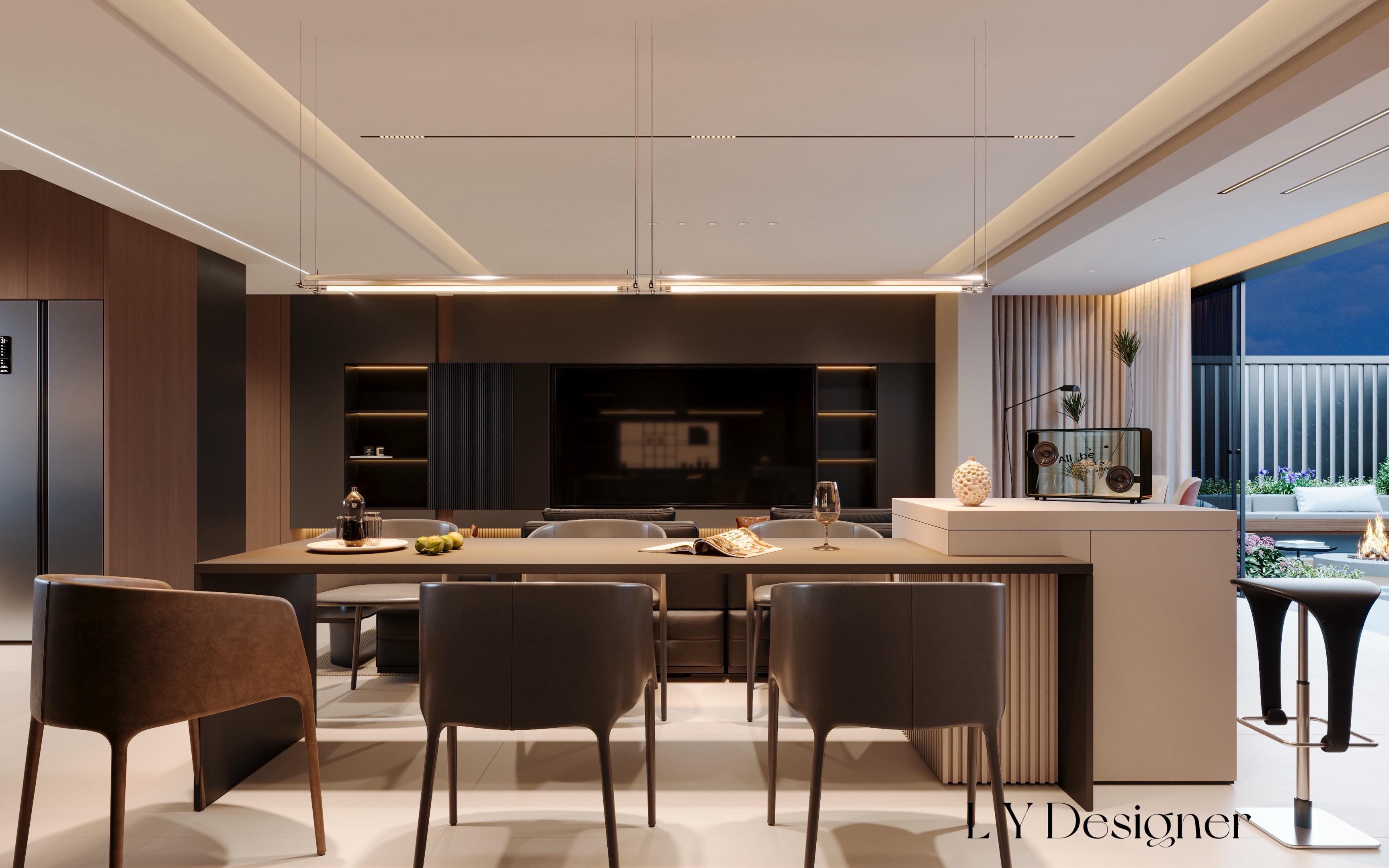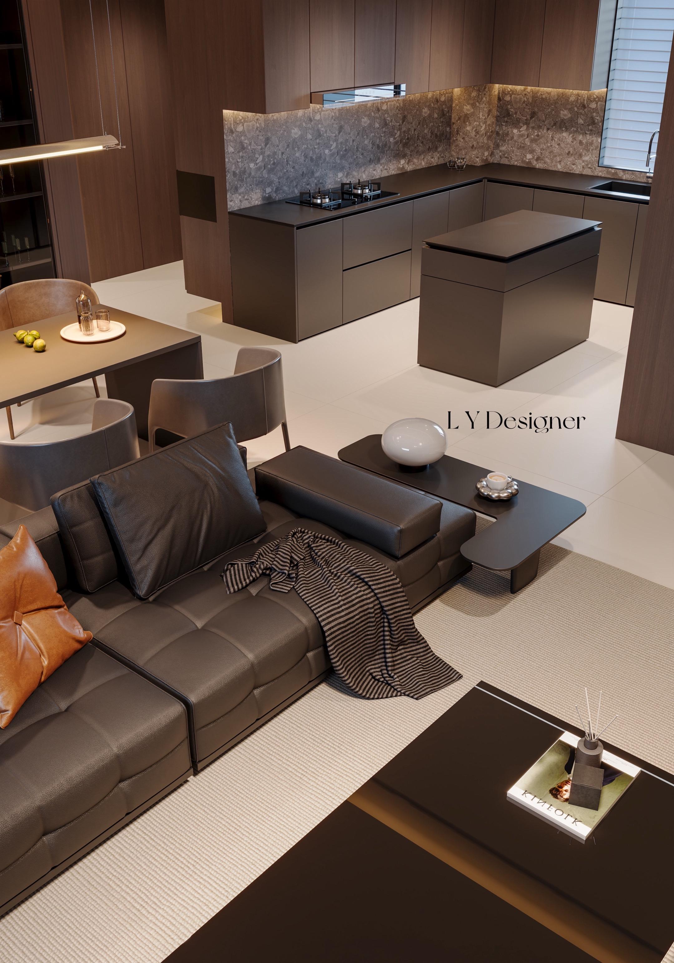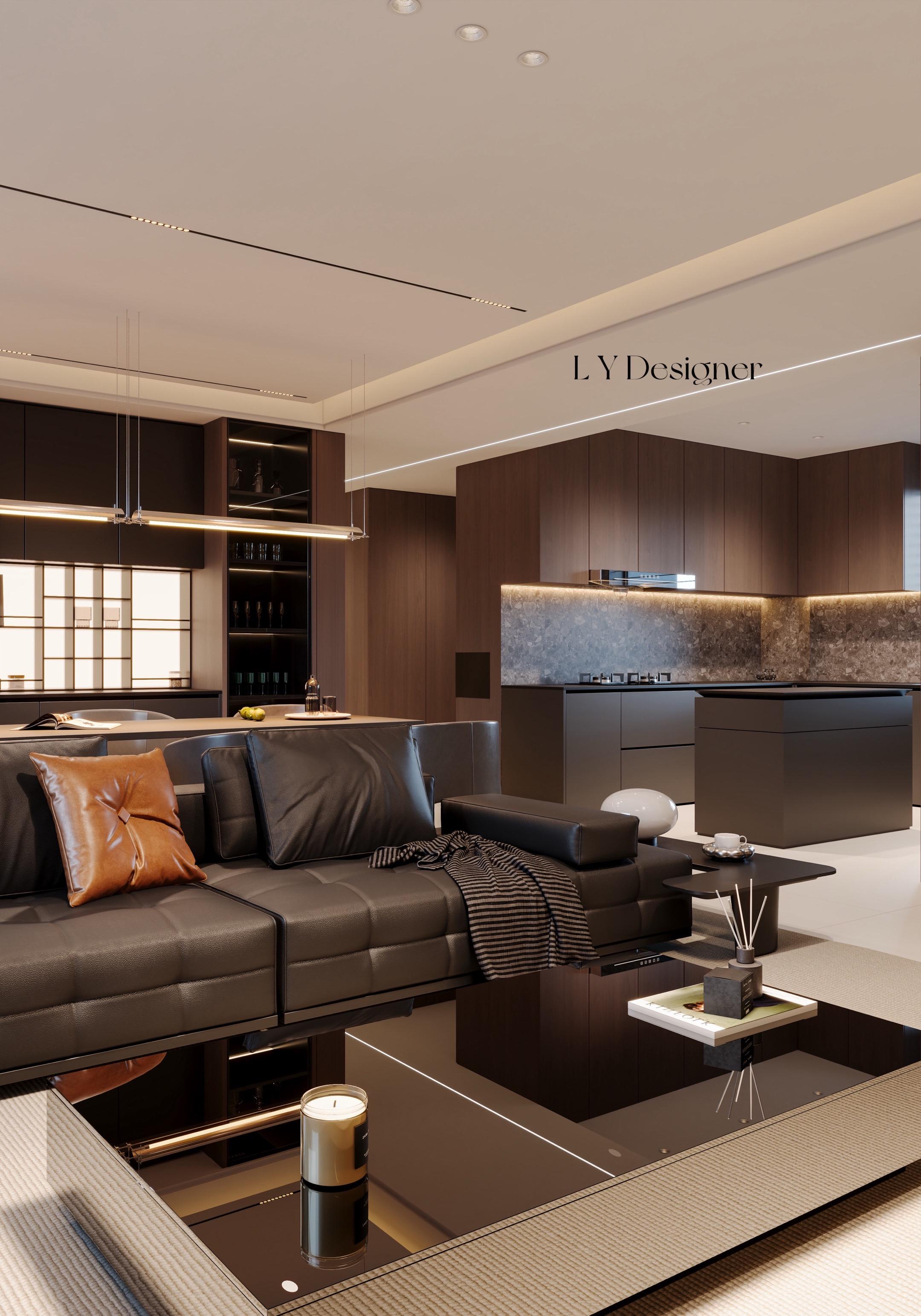 • 𝑳𝒀 𝑫𝑬𝑺𝑰𝑮𝑵 辽宁设计 风格定位:意式轻奢风 🏻核心色调:以深灰、深棕、黑色为主,搭配少量暖咖色(如抱枕)作为点缀,营造出沉稳、内敛又不失温度的氛围。 🪵材质运用:大量使用皮革(沙发)、木饰面(橱柜、背景墙)、石材(台面、后挡板)和金属(灯带、边框),体现"隐奢"质感。 🏠设计语言:线条利落、造型简洁,无多余装饰,强调"少即是多"的极简哲学。 空间布局与功能设计 💭开放式LDK布局:客厅、餐厅、厨房一体化设计,视觉通透,空间感被极大放大,符合"小户型显大"的设计需求。 ?