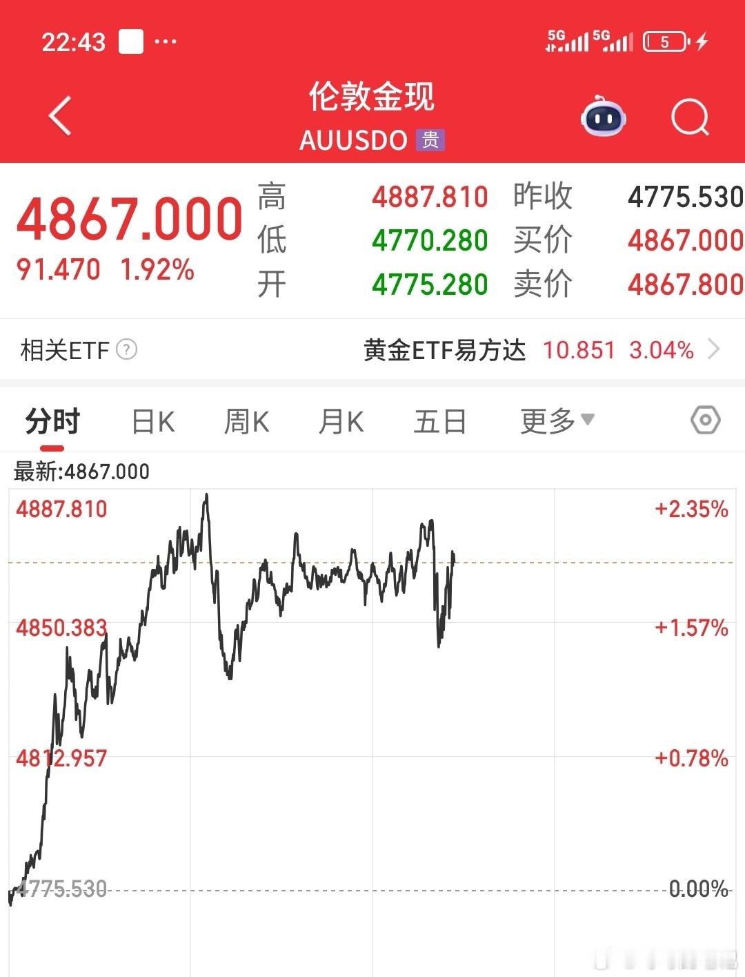 现货黄金短线下挫40美元接下来看黄金什么时候突破5000美元,是今晚还是明天或者后天,现货黄金今天又暴涨100美元,直接逼近4900美元,最高已经冲到4887美元了,市场关注特朗普在达沃斯上的讲话,对格陵兰岛的决心,欧美贸易摩擦似乎已成定局了