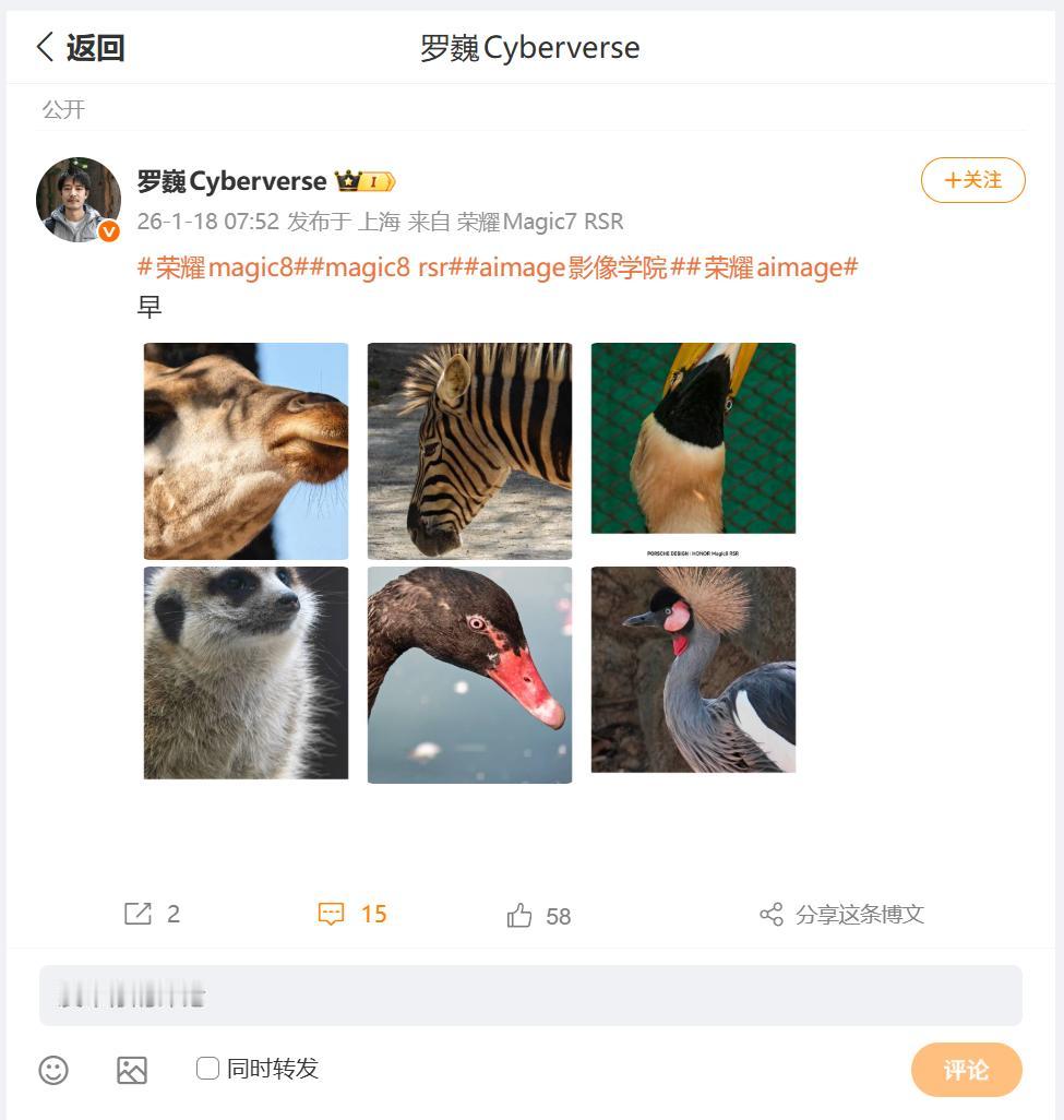 小伙伴们去动物园,只能远远的观看动物,如果想要清晰的观看动物的话,荣耀Magic8 RSR保时捷设计的潜望长焦,搭配荣耀大王算法的加持,那效果就是相当满意,荣耀首席影像工程师罗巍分享的这组动物长焦照片,大家觉得怎么样呢?畅聊数码新品 数码资讯