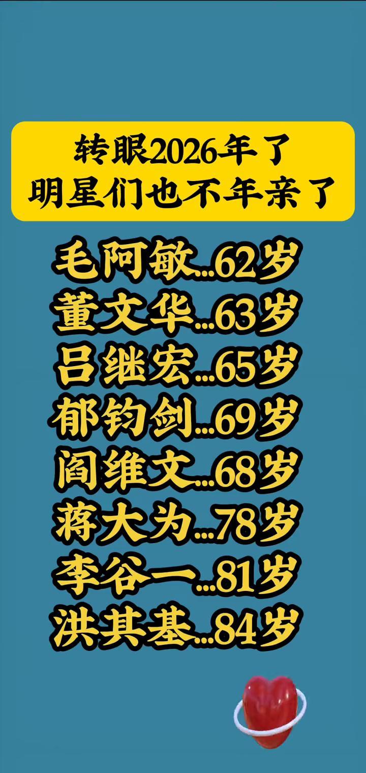 刚看到一份“2026年艺术家年龄表”,我愣住了。 董文华 6岁? 阎维文 6岁? 吕继宏 5岁? 这数据是谁整理的? 太离谱了! 这哪是年龄表,简直是“返老还童”魔幻剧。 核实了一下,他们2023年的真实年龄是这样的: 毛阿敏59岁,董文华61岁。 吕继宏63岁,郁钧剑66岁。 阎维文65岁,蒋大为76岁。 李谷一79岁,洪其基82岁。 数字背后,是整整一代人的记忆。 更让人敬佩的是,他们大多依然活跃。 阎维文老师去年还站在春晚舞台上,歌声依旧铿锵。 李谷一老师虽已退休,仍心系音乐,做着指导工作。 艺术生命,从来不是数字能定义的。 他们的歌声陪我们长大,如今听来,每段旋律都是时光。 忽然觉得,错的不是年龄数字。 而是有人忘记了,真正的艺术家,他们的作品和影响力,永远“正值当年”。 你最近一次听他们的歌,是什么时候? 评论区里,说说你最爱的那一首吧。