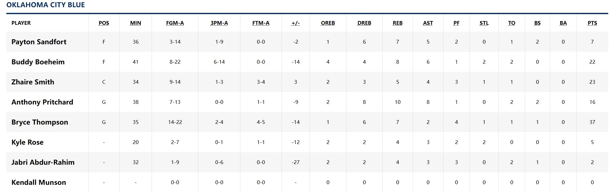 小蓝队在主场112:127不敌奥斯汀马刺,战绩变为2胜11负。布莱斯·汤普森轰出37分7板,扎伊尔·史密斯14中9得到23分5板4助,勃海姆22中8收获22+8+6,桑德福特14投只有3中,三分9中1。编辑by蓝色狂潮OKC雷霆vs雄鹿雷霆战胜骑士雷霆