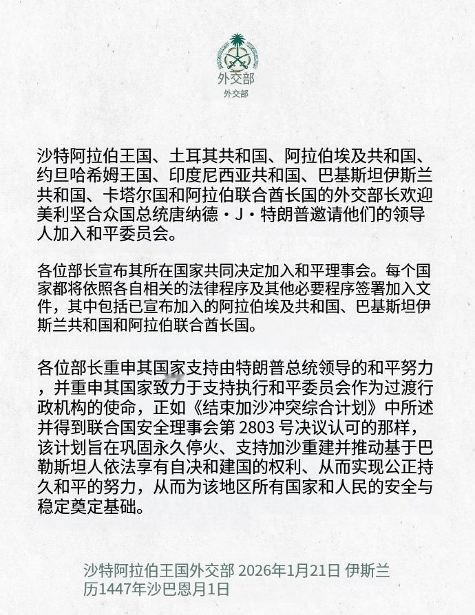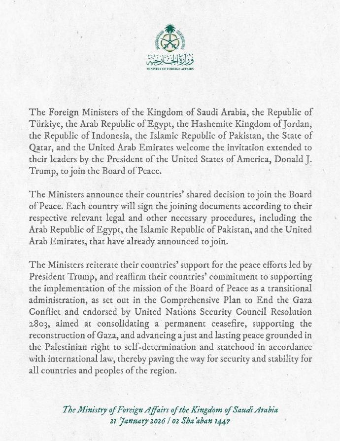 80亿美金到手:八国发声明感谢川普邀请加入 "和平委员会“! 这八个国家分别是: 沙特、土耳其、埃及、约旦、印度尼西亚、巴基斯坦、 卡塔尔和阿拉伯联合酋长国! 每个国家的入会费是10亿美金! 就这么轻松赚到了80亿美金哈!