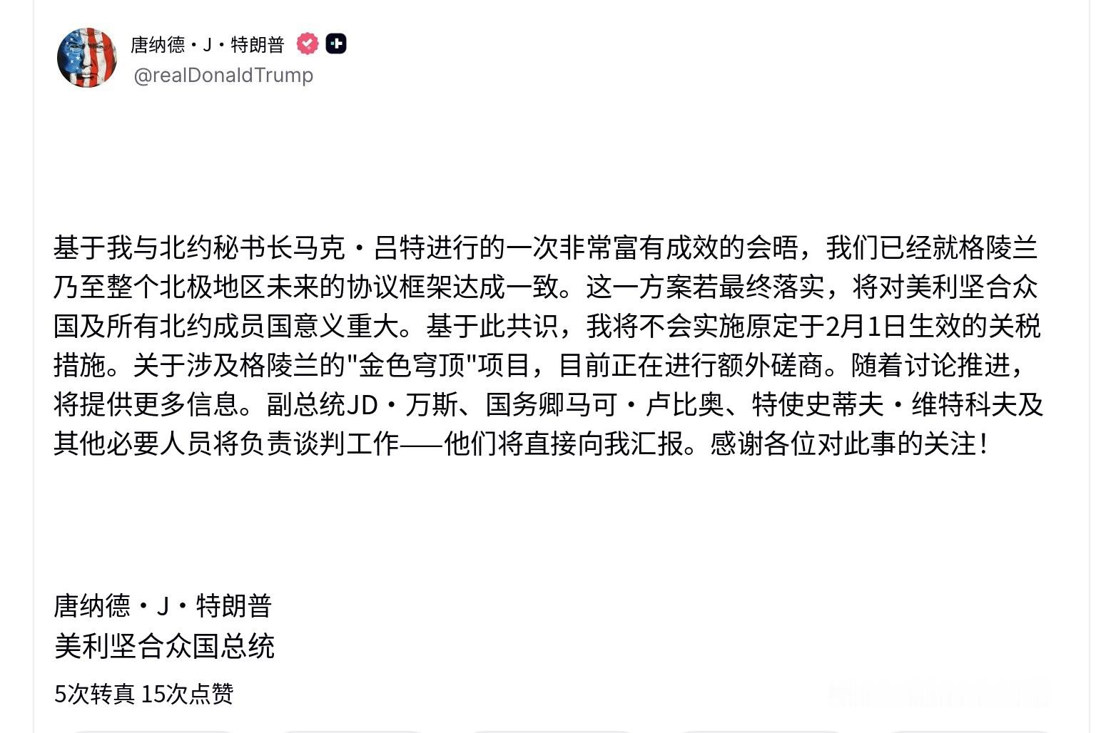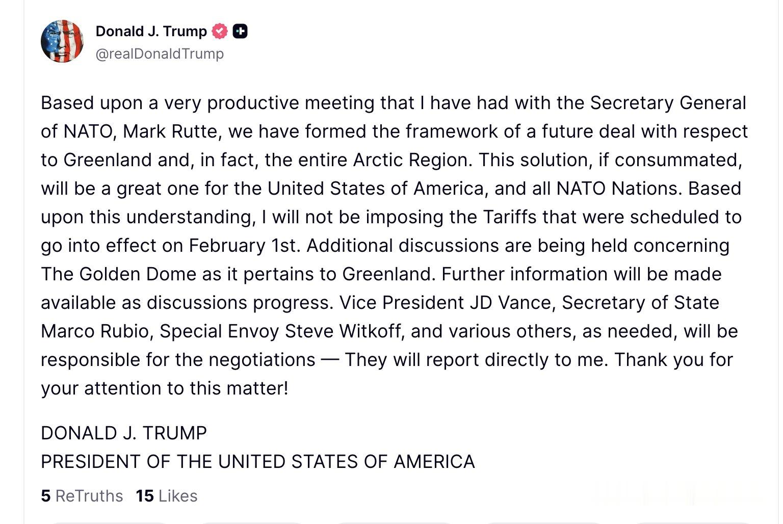 🔻特朗普:“基于我与北约秘书长马克·吕特举行的一次非常富有成果的会议,我们已经就格陵兰乃至整个北极地区达成了一项未来协议的框架。这一方案若能最终落实,对美利坚合众国及所有北约成员国都将意义重大。基于此共识,我不会实施原定于 2 月 1 日生效的关税措施。目前关于涉及格陵兰的‘金穹’议题正在进行进一步磋商,随着谈判推进将提供更多信息。副总统 JD·万斯、国务卿马可·鲁比奥、特使史蒂夫·维特科夫及其他必要人员将负责谈判工作——他们将直接向我汇报。感谢各位对此事的关注!”🔻TACO!!!🔻via realDonaldTrump特朗普回应格陵兰岛人不愿加入美国 热点现场 海外新鲜事 国际局势
