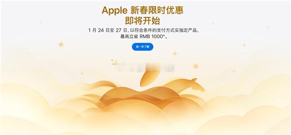 苹果中国官网出新春限时优惠页面,活动时间定在1月24日到27日符合要求的支付方式买指定产品,最高能省1000元,部分享最高24期免息分期具体来看,iPhone16和16Plus优惠300元,16e少200元,Mac里14和16英寸Pro(M4Pro/Max)省最多,有1000元iPad、ApplePencil、AppleWatch和AirPods也有优惠,像iPadPro(M5)减400元,AirPodsMax省300元,不过得用指定支付方式,且每个品类限购2件,线下门店部分商品数量还有限