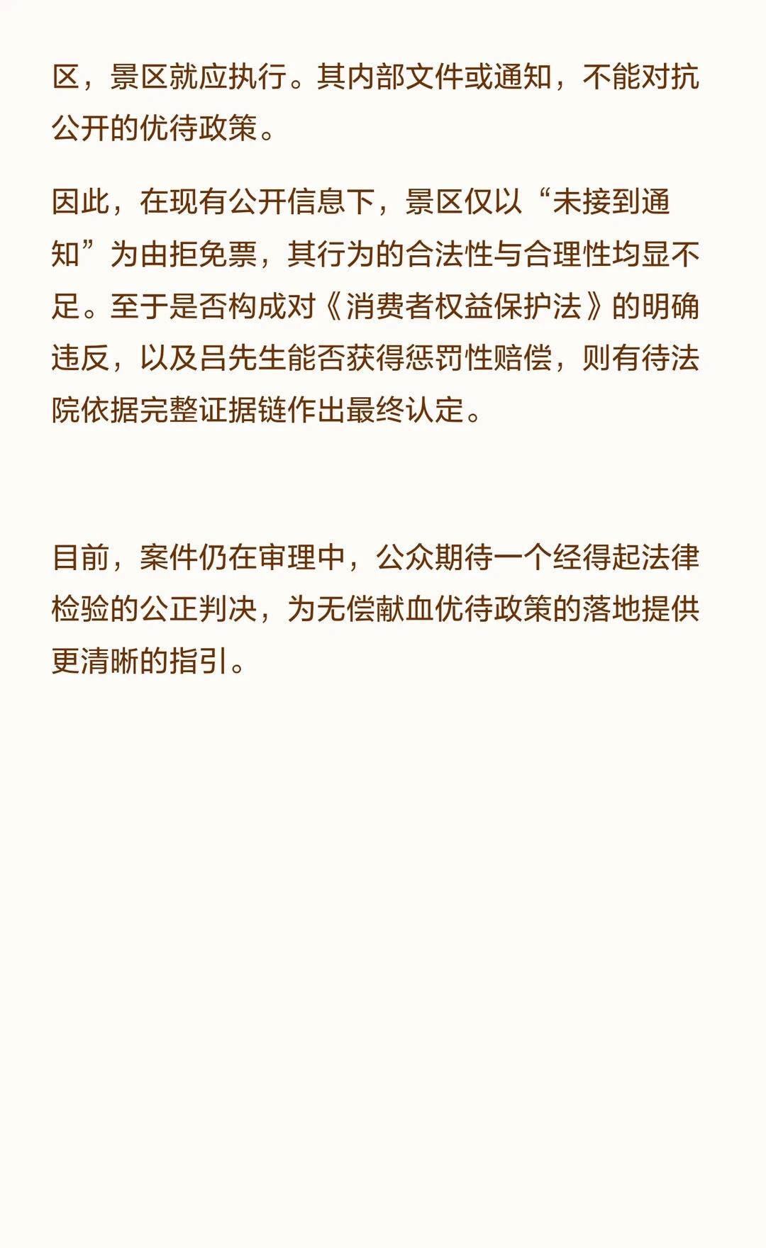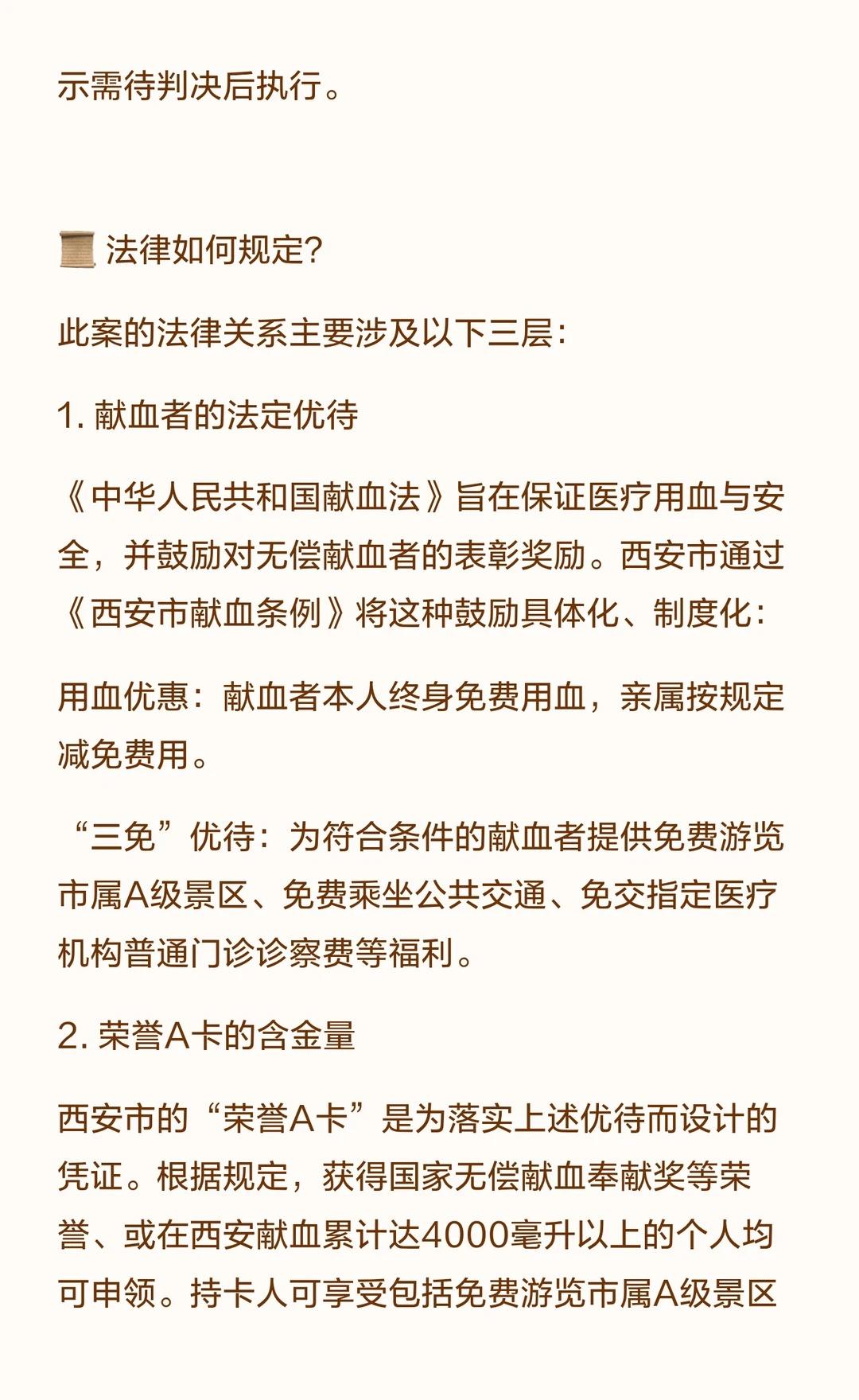 献血2.2万毫升,景区拒免票,被起诉仍不退 西安市民吕先生因未接到通知被景区拒免票,后起诉景区。吕先生累计献血57次,获全国无偿献血金奖,持有“荣誉A卡”,享受免费游览景区等优待。景区需在判决后退款。法律 热点 热门 法律咨询 社会百态
