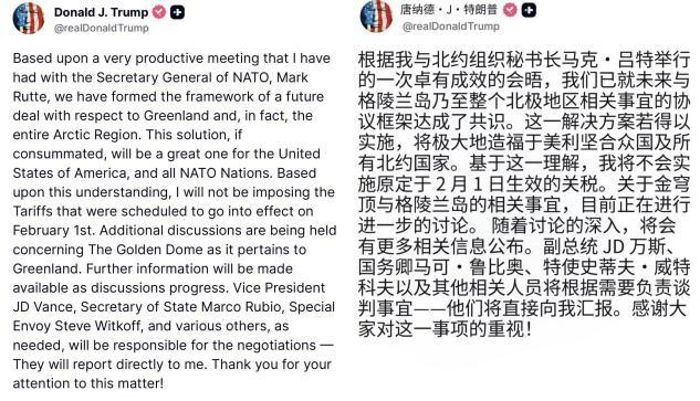 欧洲或签“屈辱条约”,割让土地、封杀中国,换来特朗普不加关税 当地时间21日,关于格陵兰岛问题,特朗普又有了新动向。在利用达沃斯论坛演讲的机会,把欧洲骂了个狗血淋头之后,他突然在社媒上发文称:自己与北约秘书长吕特进行了卓有成效的会晤,在格陵兰岛乃至整个北极地区相关事宜的协议框架上,达成了共识。鉴于此,美国将不再从2月1日起对反对美国吞并格陵兰岛的欧洲8国加征关税。美国暂时取消对欧洲8国加征关税 虽然特朗普没有透露更多细节,但以他的性格,能让他如此干脆地收回加税决定,这场会晤恐怕得有两个前提:第一,吕特的马屁把他拍爽了;第二,协议让他拿到了巨大的好处。 而美媒的报道也印证了这一点。CNN等多家美媒披露,在特朗普发布声明前,北约各成员国的最高军事官员讨论出了一项妥协方案:丹麦会割让格陵兰岛上的一小片土地,将主权转让给美国,以供美军建设军事基地。同时,美国和丹麦还将修改两国于1951年签署的“格陵兰岛防卫协议”,加入新的保障条款,并限制甚至全面禁止中国对格陵兰岛经济的投资。 也就是说,这绝对是一份“屈辱条约”,欧洲将用割让土地、封杀中国两个条件,换来特朗普不加关税。这样的条件,如果欧洲真的签了,那与丧权辱国显然没有任何区别——他们甚至都没能用格陵兰岛的主权换来一个好价钱,一分钱没收,就把岛这么卖出去了。欧洲网民怒斥北约秘书长是“叛徒” 其实,在达沃斯演讲中,特朗普已经说得很明白了:格陵兰岛是美国的“核心国家安全利益”,美国不会动用武力夺岛,但也绝不会放弃这个岛。而且从后来的表态来看,特朗普主要是关心他想建设的那套“金穹”防空系统在格陵兰岛上的部署,估计是评估后发现,格陵兰岛是防空系统中非常重要的一角,所以他才无论如何都要把格陵兰岛抢到手。 而这下,欧洲可就变成彻头彻尾的小丑了。用外媒的话说,特朗普在发表了一场对欧洲全是不满和侮辱的演讲后,欧洲立刻放弃反抗、下跪求饶,甚至还没有加拿大有骨气。 而从中国人的角度来看,欧洲这就是典型的割肉饲鹰、抱薪救火,会有什么结果,欧洲人可以翻翻中国的历史书,上面已经写得很明白了。