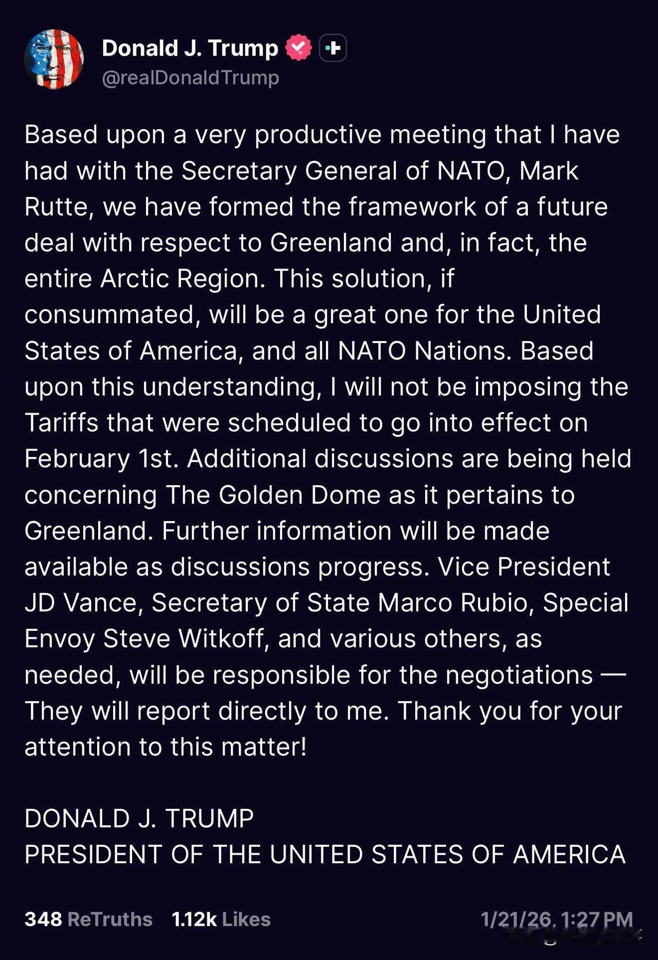 美国总统特朗普昨天宣布,他与北约秘书长吕特已就格陵兰岛和北极地区问题达成了未来协