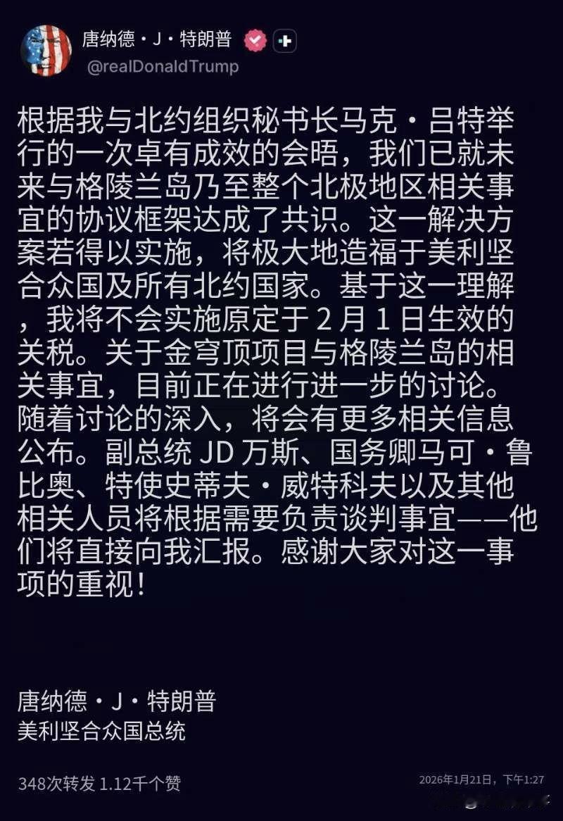 美国总统特朗普昨天宣布,他与北约秘书长吕特已就格陵兰岛和北极地区问题达成了未来协议的框架,并撤回了原定于2月1日对欧洲8国实施的关税措施。