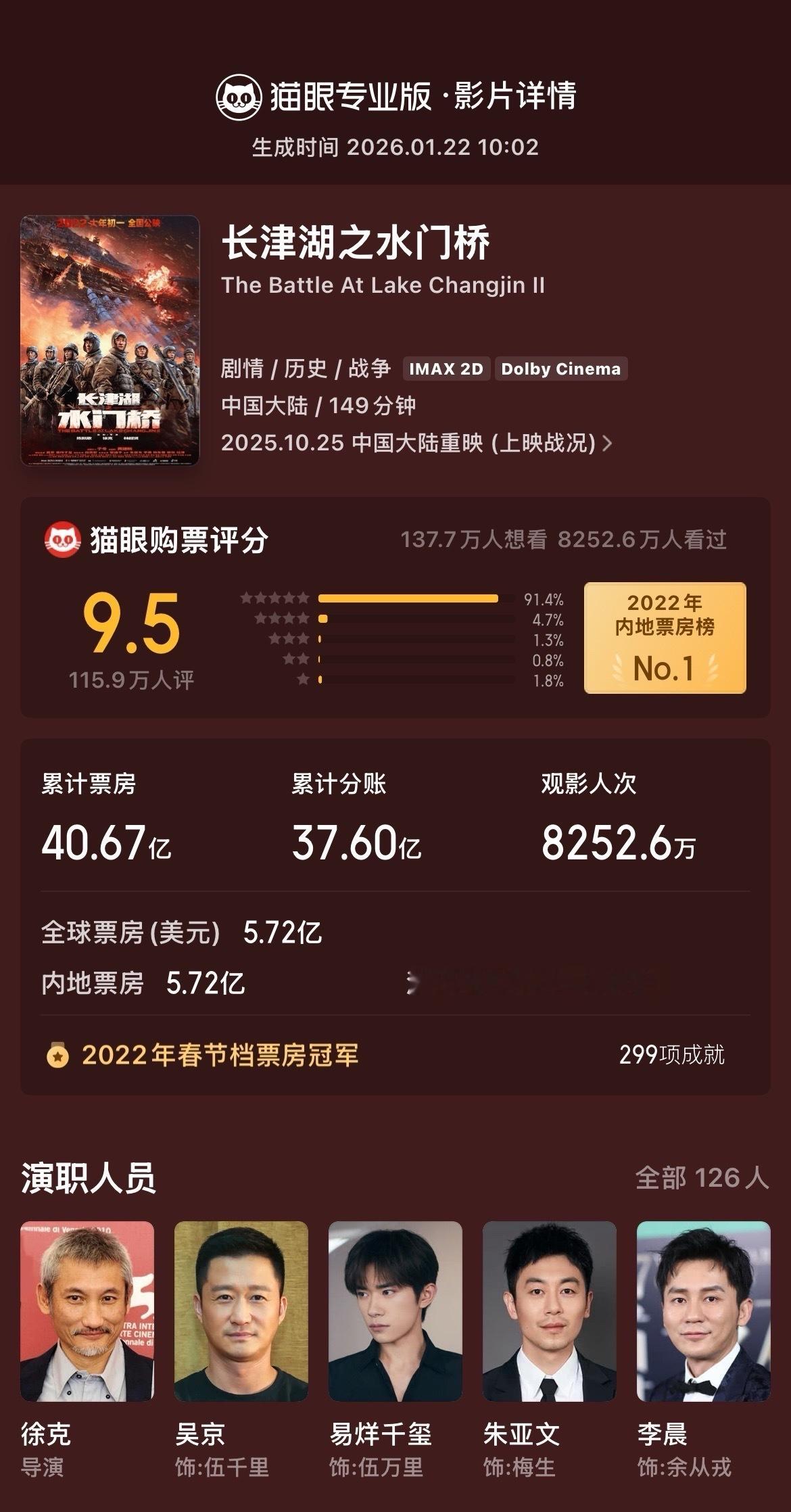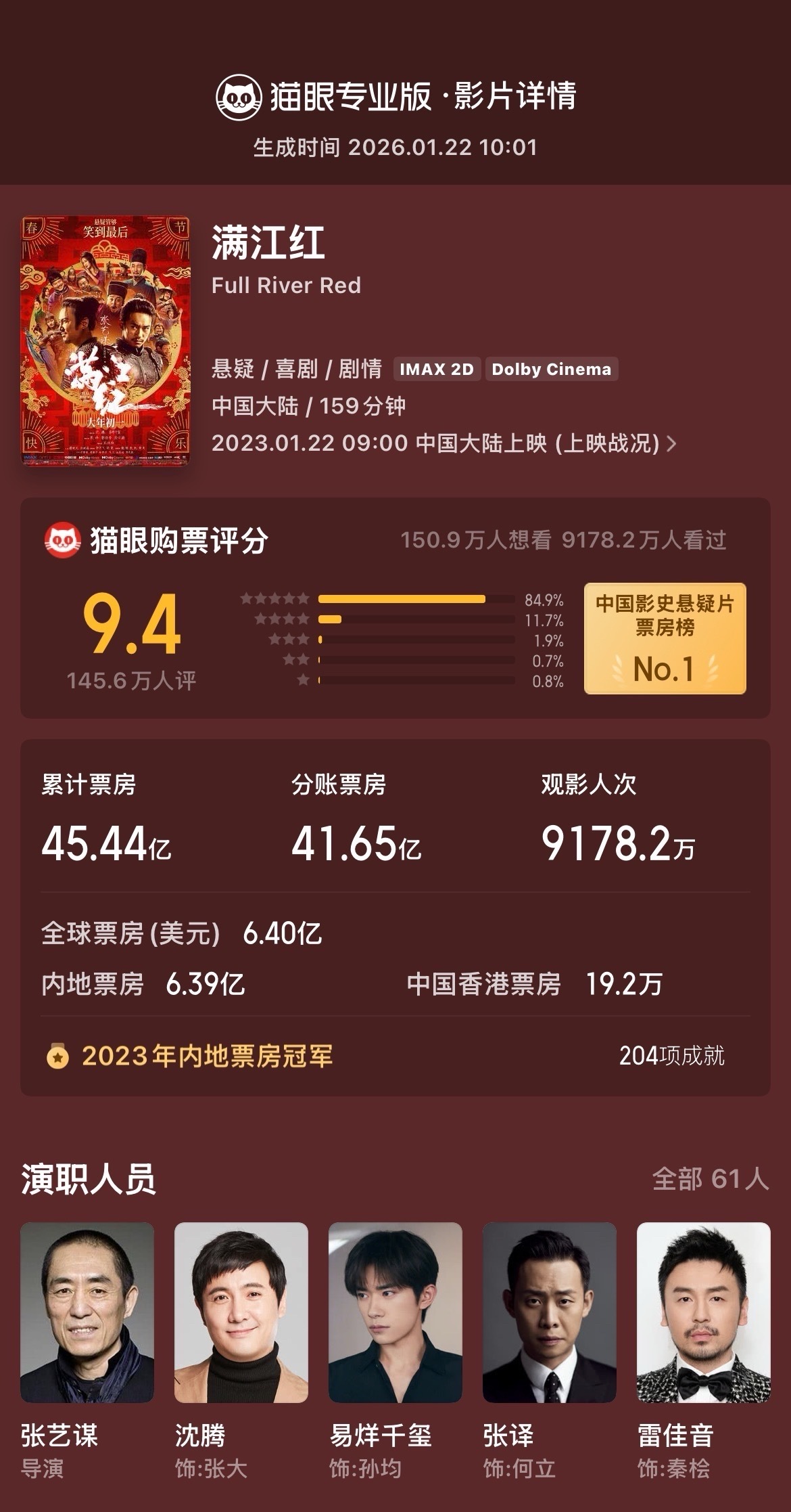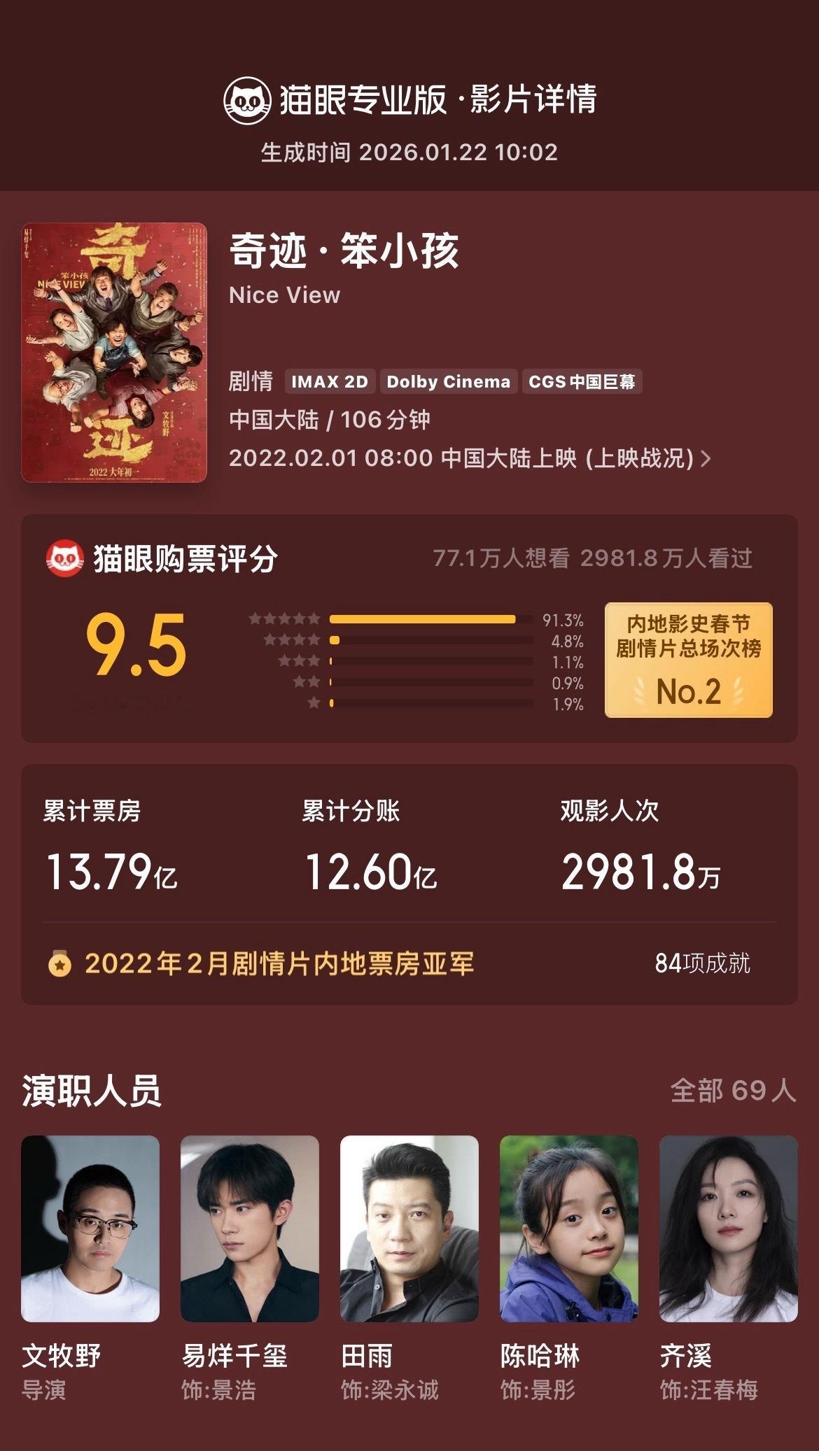 易烊千玺三登春节档 据猫眼专业版显示,《惊蛰无声》官宣定档2026春节档上映, 5年间三次登春节档,分别为2022年《长津湖之水门桥》《奇迹·笨小孩》、2023年《满江红》、2026年《惊蛰无声》。-《满江红》累计票房达45.44亿,打破纪录24项,获得里程碑时刻193项,获奖及提名11项;-《长津湖之水门桥》累计票房达40.67亿,打破纪录88项,获得里程碑时刻290项,获奖及提名9项。-《奇迹·笨小孩》累计票房达13.79亿,获得里程碑时刻47项,获奖及提名37项。4部影片定档2026春节档上映