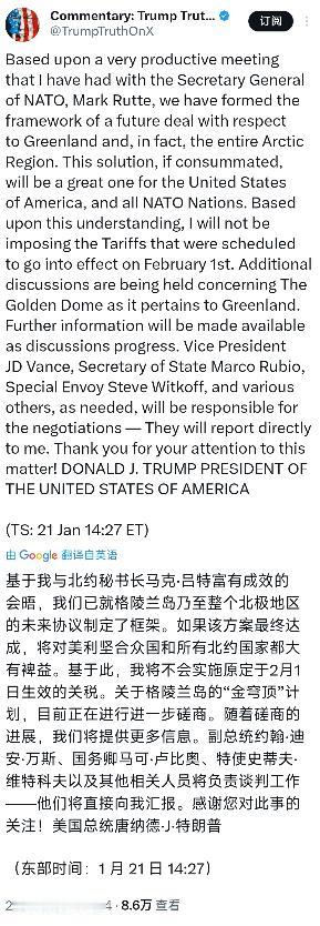 突发新闻:特朗普宣布,他不会按原计划于2月1日对丹麦、英国、法国、德国、荷兰、瑞典和芬兰加征关税。 特朗普今天(北京时间1月22日)写道:“基于我与北约秘书长马克·吕特的一次非常富有成效的会谈,我们已经为一个关于格陵兰及整个北极地区的未来协议搭建了框架。如果这一方案最终落地,这将对美利坚合众国以及所有北约国家来说都是一件非常棒的事。基于这一理解,我将不会实施原定于2月1日生效的关税。关于‘金穹’项目在格陵兰相关事宜,我们正在进行进一步讨论。随着对话推进,会公布更多信息。副总统JD·万斯、国务卿马尔科·鲁比奥、特使史蒂夫·威特科夫以及其他相关人士,将根据需要负责谈判——他们将直接向我汇报。”   北约秘书长吕特这次会谈递了台阶。框架协议里没提主权归属,却给了美国两个实惠:一是允许"金穹"系统在格陵兰扩建,现有防务条约基础上增加联合部署;   二是拉北欧七国搞北极安全集体行动,等于让欧洲盟友分摊成本。特朗普算过账,真要硬收关税,欧洲八国能联动抵制"金穹"落地,丹麦再把图勒基地使用权打折,得不偿失。   再说关税这张牌,原本是吓唬欧洲的。去年底欧洲八国在格陵兰搞联合军演,表面是象征性防御,实际是给美国划红线——你动武就是攻击盟友。特朗普再强硬,也不敢在北约内部制造分裂。   现在框架协议把"购买主权"换成"联合开发",既保留了军事存在,又给欧洲留了面子,德国财长说的"别乐观太早",恰恰说明欧洲认了这个折中方案。   谈判团队的配置也有意思。副总统万斯主谈,国务卿鲁比奥兜底,特使威特科夫盯着"金穹"细节。这三人组合既能压得住北约,又懂北极军事部署。   特别是威特科夫,去年就负责过格陵兰矿产开发谈判,知道美国想要的稀土、石油藏在哪片冰盖下。框架协议里的"矿产权益"四个字,才是特朗普真正的目标清单。   还有时间窗口的问题。"金穹"系统2029年才落地,现在闹僵了,欧洲有的是时间在基建上使绊子。   比如丹麦拖延基地扩建审批,挪威收紧北极空域管制,这些小动作都能让项目延期。特朗普取消关税,换来的是北约内部的"快速通道"——七个北极国家承诺60天内拿出具体合作方案,这比关税战划算多了。   最关键的是,特朗普不想重演2025年的尴尬。当时他威胁动武收购,结果格陵兰全民公投92%反对,丹麦召回大使,北约内部吵成一团。   现在学聪明了,把主权问题虚化,用"国家安全合作"包装,既符合北约宪章,又避开国际法争议。吕特事后强调"没谈主权",正好给双方下台——美国拿到实际控制权,欧洲保住名义主权。   至于关税取消后的博弈,特朗普留了后手。6月1日的25%关税威胁还悬着,谈判团队直接向他汇报,意味着随时能重启制裁。欧洲那边也清楚,德国在达沃斯私下交底,只要"金穹"部署不涉及主权让渡,愿意开放部分矿产勘探权。这种默契让双方都有退路,又不至于撕破脸。   说到底,特朗普玩的还是交易逻辑:用关税压力换战略空间,用框架协议绑住欧洲。他心里清楚,真把盟友逼急了,北约可能在乌克兰问题上分心,俄罗斯在北极的军事存在就会趁机扩张。暂时搁置关税,换来的是北极防线的实质推进,这买卖在商人总统眼里,划算。   官方信源及发布时间:新华社,《特朗普称已就格陵兰岛制定协议框架不会对欧洲加征关税》,2026年1月22日6时33分