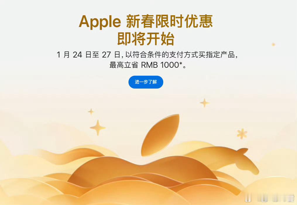 苹果推出新春优惠 Apple中国官方网站宣布即将开启新春限时优惠,官方称,1月24日至27日,以符合条件的支付方式买指定产品,最高立省 1000元,还可享最高 24期免息分期。遗憾的是今年爆火的iPhone17系列不在此次优惠名单中。具体大家可以去苹果官网查看。印象中,苹果很少会搞这种降价促销活动,看来国内厂商还是给了苹果很大压力,卷起来吧科技先锋官