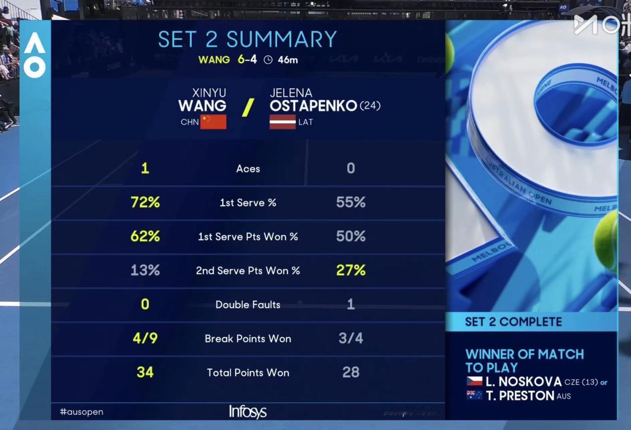人美心善的王右必将逆转奥胖晋级!澳网第二轮:王欣瑜1-1奥斯塔彭科。 首盘:王欣