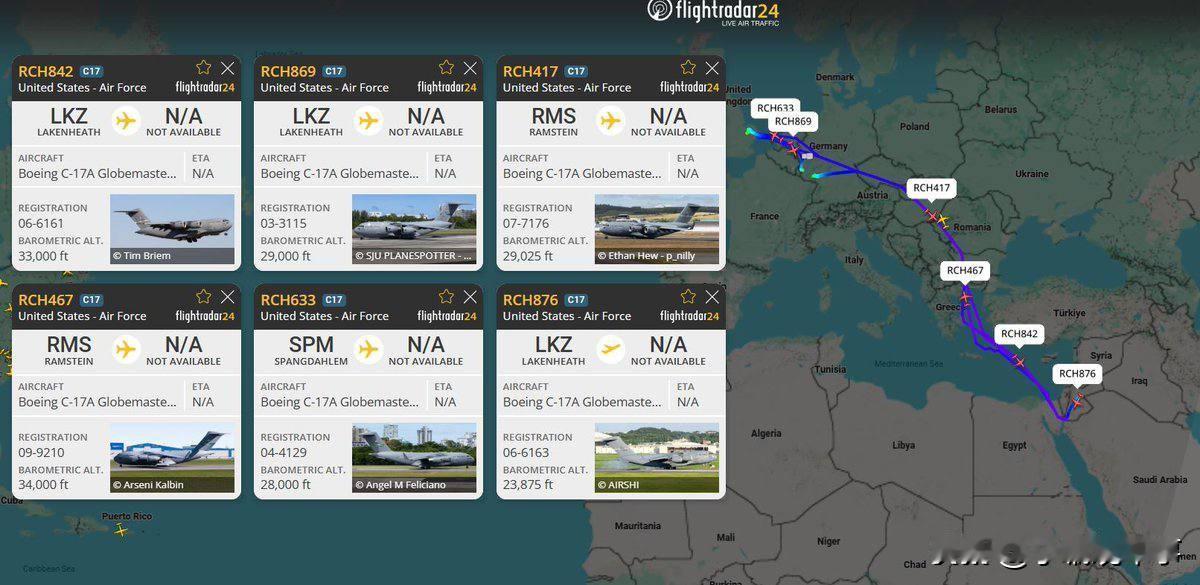 美国继续向中东地区增兵。 八架C-17A“环球霸王III”军用运输机正从德国(拉姆施泰因空军基地和斯潘达勒姆空军基地)和英国(莱肯希特空军基地)起飞,前往卡塔尔的阿尔乌代德空军基地和约旦的穆瓦法克·萨尔蒂空军基地。