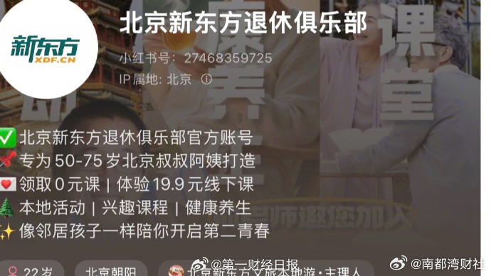 【#俞敏洪开办退休俱乐部# ,#新东方股价冲高回落# 】1月22日,港股开盘,恒生指数高开0.62%,恒生科技指数涨0.85%。新东方(9901.HK)股价43.12港元,涨0.23%,短暂冲高后有所回落,截至发稿,股价微涨0.05%。近日,“北京新东方退休俱乐部”账号开始陆续在各社交网络平台上线运营,页面显示,该账号是北京新东方退休俱乐部官方账号,专为50-75岁北京叔叔阿姨打造。提供本地活动、健康养生、兴趣课堂。线上课0元领取,线下课体验价格19.9元。