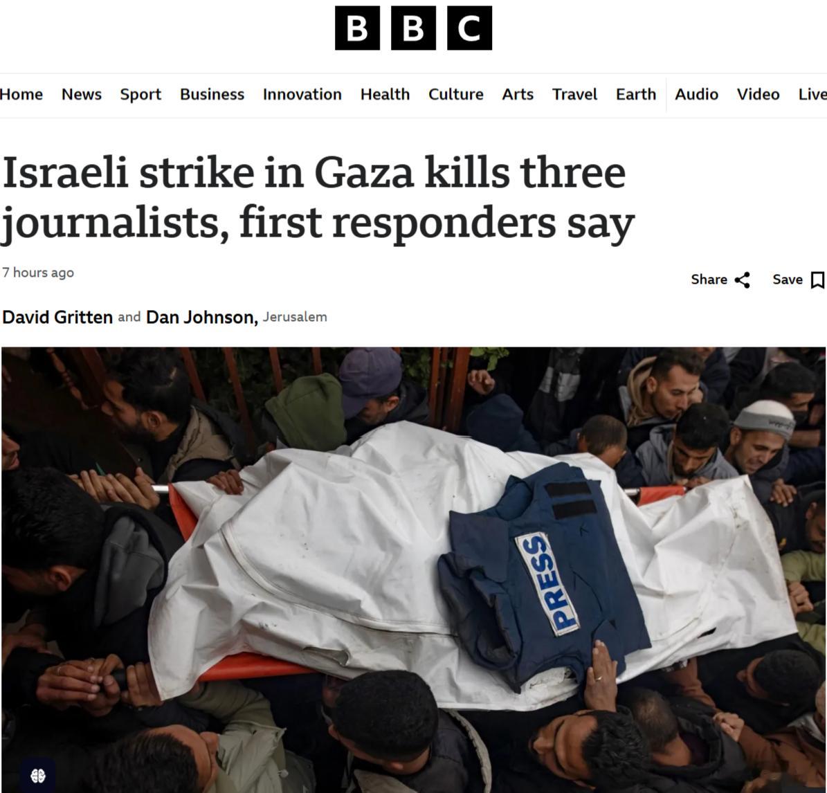 BBC:以色列对加沙的袭击造成三名记者死亡,其中包括一名法新社的记者。不得不说,西方记者的职业精神还是值得肯定的,不要说世界热点事件和冲突现场几乎都是西方记者冲在第一线,你看那些西方派驻中国的记者,哪怕冒着被逮捕的风险也不放过任何一个用来造谣抹黑中国的机会,难怪我们有些媒体只能转发西方媒体的报道拾人牙慧!