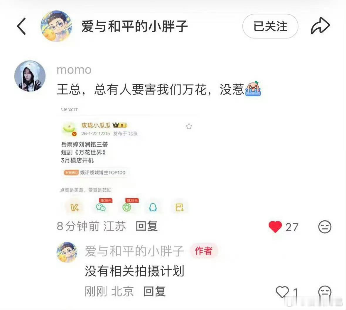 打假来得好快王一栩力挺鞠婧祎话说万花世界长剧开拍了吗