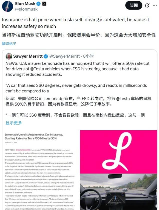 马斯克每天除了宣传Grok,剩下的就是不断强调FSD的安全性。事实证明FSD真的很安全,美国保险公司Lemonade宣布,只要车辆启用了FSD,就能提供50%的保费折扣。我相信算力的能力远大于人类,而且它不会走神,不会打瞌睡,正如前段时间马斯克在访谈里提到的,AI的能力正在以每年10倍的速度飞速增长,到2030年,AI的思维能力将超过全球80亿人口的总合。但那都是以后的事情了,谁也说不准,现在我只关心国内到底什么时候才能用上完全体的FSD啊,我太好奇了。特斯拉马斯克回应特斯拉保费减半