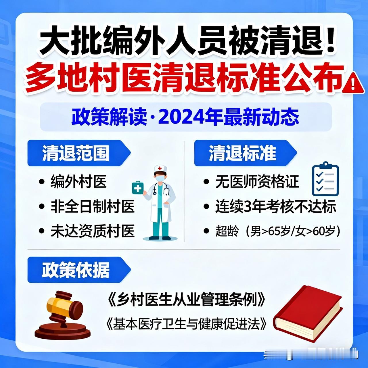 基于搜索获取的政策动态、地方实践与行业影响,我将围绕“编外人员清退”与“村医清退标准”两大核心,从改革背景、政策细节、地区实践、群体影响及未来趋势五个维度展开创作,既呈现改革的必然性,也关注基层医疗的转型阵痛与保障措施。 编外清退浪潮下,村医队伍迎来专业化重构 2025年以来,一场覆盖全国的编外人员清理改革正在纵深推进。中央编办与人社部联合印发的《深化事业单位改革实施方案》明确提出,2025-2027年将逐步清退约870万名编外人员,占现有编外总量的32%,目标是将编外人员占比压降至25%以下,彻底扭转“编外多于编内”的倒挂格局。在这场涉及2700万编外人员命运的改革中,医疗系统尤其是乡村医生群体成为政策聚焦的重点领域,多地密集出台清退标准,标志着基层医疗队伍正从“数量保障”向“质量提升”全面转型。 一、改革全局:编外清退的政策逻辑与全国实践 编外人员作为体制内的“补充力量”,曾支撑起机关事业单位46.6%的工作量,但也带来了财政负担加重、管理不规范等问题。此次改革以“分类施策、精准清退”为原则,三类岗位成为清理重点:机关工勤岗通过社会化外包实现转型,行政辅助岗借助数字化技术替代人工,生产经营类岗位则全面脱编转企。从地方实践来看,清退工作已取得显著成效:湖北十堰市清理编外人员326人,年节省财政1500万元;河南源汇区清退30名编外人员,每年节流资金108万元;湖南益阳高新区更是创下79.46%的核减率,将编外人员从521人压缩至107人以内。 改革并非简单“减员”,而是构建“岗位管理为主、身份管理为辅”的新型用工机制。对于编外人员,各地开通了多元转型通道:具备核心技能的专业人才可通过专项考核转正,上海2025年一季度就为1.2万名编外人员办理入编手续;可替代性强的岗位通过政府购买服务承接,衡阳市将环卫作业外包后,人力成本压降37%;未被清退人员则纳入“同工同酬”范围,薪酬社保向编内人员看齐。与此同时,编内人员的“铁饭碗”也被打破,医疗、教育等行业推行“末位调整”,高校医院全面实行“员额制”,编制资源向核心人才倾斜。 二、聚焦村医:清退标准的地方差异与核心导向 在医疗系统编外清理中,乡村医生群体因涉及基层医疗“最后一公里”保障,政策设计更为精细。截至2026年初,贵州、新疆、江西、河南等多地已公布明确清退标准,核心围绕资质达标、考核合格、合规履职三大维度,同时兼顾地区医疗资源差异。 新疆卫健委2025年10月发布的《征求意见稿》堪称“最刚性标准”,明确三类村医必须解聘:未在规定期限内取得执业(助理)医师资格或乡村医生执业资格者;考核不合格、健康状况不适应工作或不服从乡镇卫生院一体化管理者;达到法定退休年龄者(特殊情况返聘不超过5年)。这一政策直指村医队伍“资质短板”,倒逼从业者提升专业能力。 贵州则采用“过程管理+动态淘汰”模式,要求新招聘村医优先具备执业(助理)医师资格,暂未达标的需具备中等以上医学专业学历并通过岗前培训;对现有未取得执业资格的村医,实行每2年一次的从业考核,不合格且未按期补考或补考仍不合格者,将注销执业注册并收回证书。这种“准入+考核”双重门槛,既保证新增人员质量,又推动存量人员优化。 江西永丰县的清退标准更为全面,涵盖9大对象,包括非卫生专业人员从事医疗技术岗位、男满60周岁女满50周岁、5年内未取得相应执业资格、连续旷工超15个工作日或年度考核不合格且不接受调岗等情形。河南封丘县则聚焦“低学历低职称”群体,2024-2025年间累计清退初高中及中专学历临聘人员800余人,占当地医疗编外人员的近三成。 值得关注的是,部分地区采取“柔性清退”策略:不直接裁员,而是通过合同到期不续签、转为劳务派遣(仅发基本工资无绩效)等方式变相压缩编外规模,这种“隐性清退”虽规避了直接冲突,但也引发了从业者对权益保障的担忧。 三、转型阵痛:村医群体的生存挑战与保障措施 这场清退浪潮背后,是乡村医生群体的结构性困境。数据显示,截至2023年末,全国持乡村医生证的人员仅剩62.2万人,近10年减少38.3万人,30岁以下村医占比仅6.3%,老龄化、人才断层问题突出。对于50岁以上的资深村医而言,“考证难、转型难”成为普遍焦虑——江西赣州56岁的陈医生从业30年,仅有乡村医生证,如今不得不与年轻人一起备考执业资格,“不考证就只能退场”。 为缓解转型阵痛,多地同步推出保障政策,实现“清退与留人并重”。甘肃推行“乡聘村用”模式,将村医纳入乡镇卫生院统一管理,明确连续执业10年且取得执业医师资格者可通过公开选拔入编;同时为村医缴纳五险一金,解决退休后的养老问题,让从业者“有奔头、无后顾之忧”。中央财政也加大投入,累计安排14.3亿元培训乡村医生38万人。