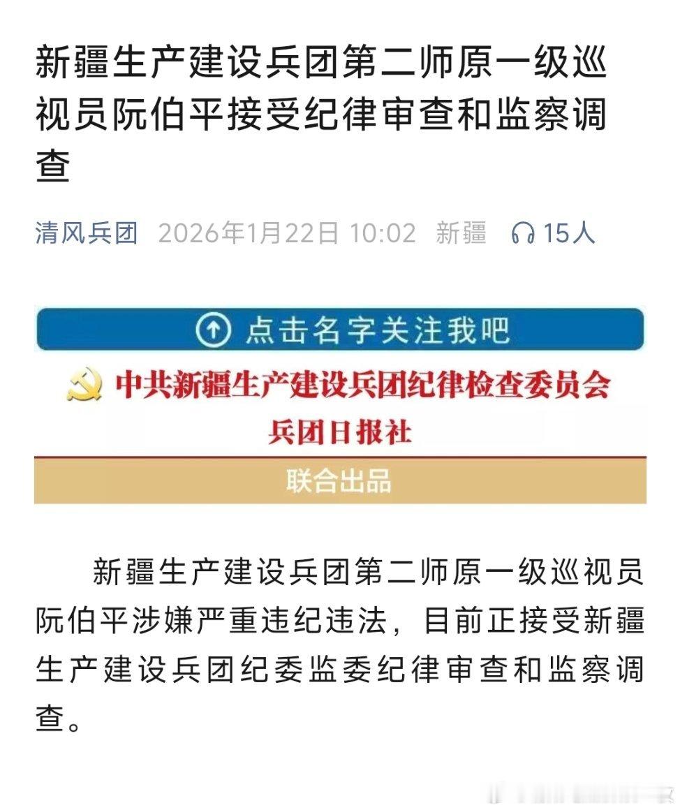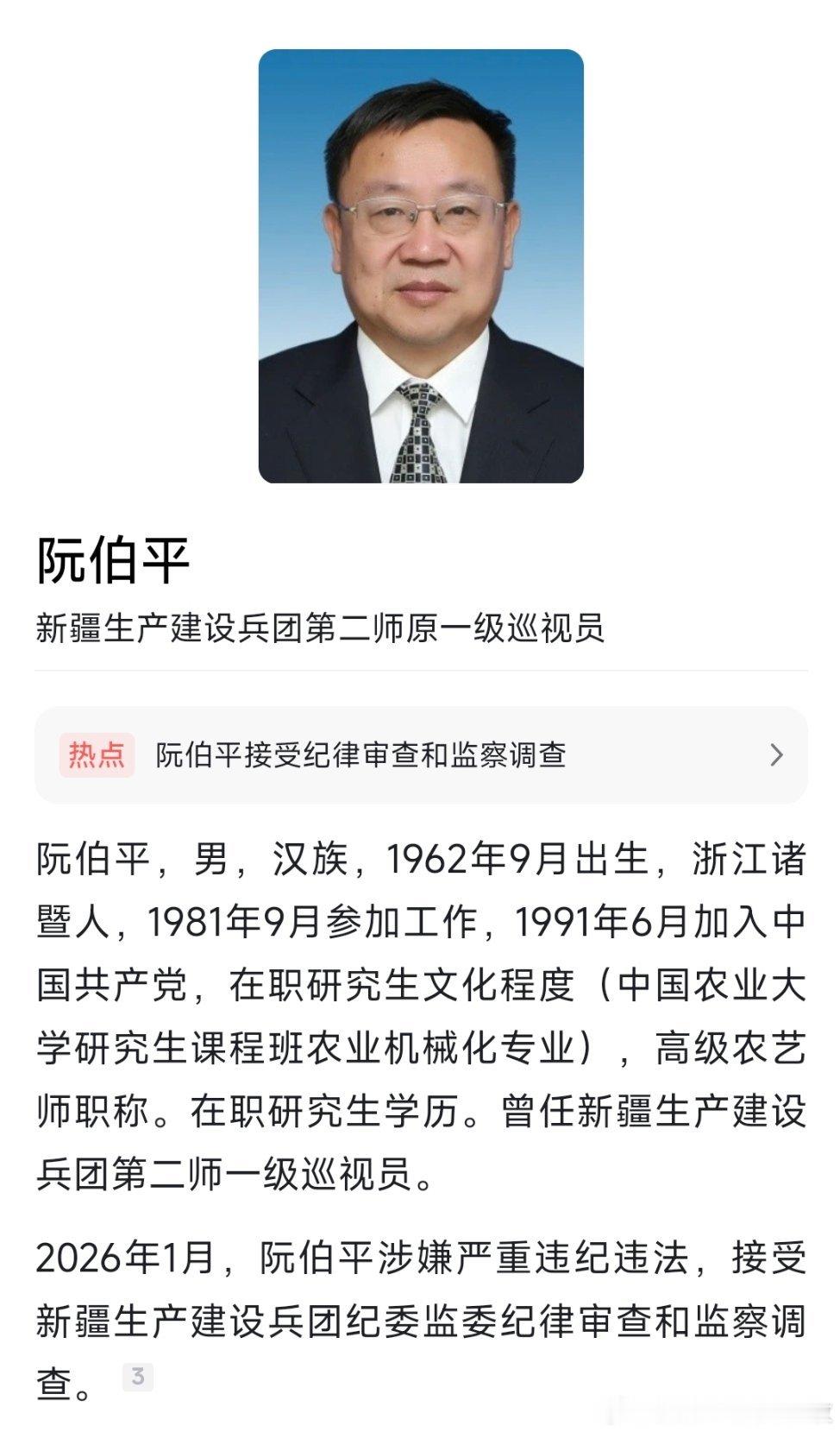 新疆生产建设兵团第二师原一级巡视员阮伯平接受纪律审查和监察调查。