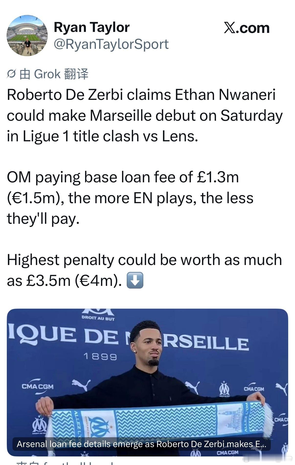 德泽尔比表示恩瓦内里可能会在周末和朗斯的焦点战上演首秀(晕,好久没关注法甲,这俩怎么一个榜首一个第三)恩瓦的基本租借费€150万,出场越少租借费越高,最高可达€400万。