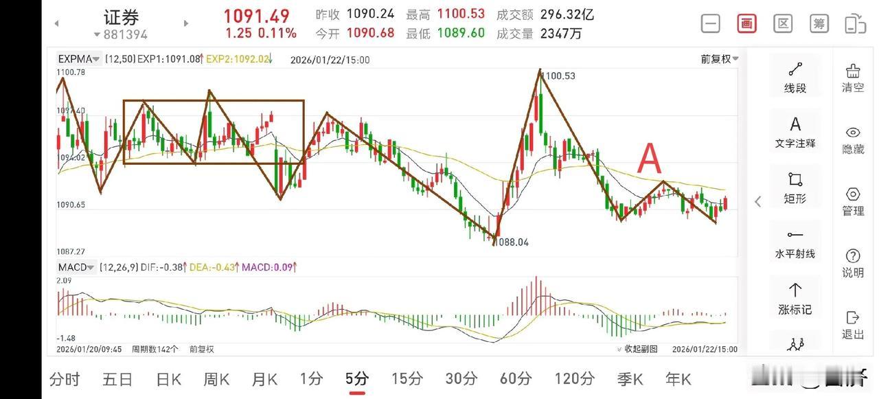 证券板块复盘(2026.1.22) 今天下午,证券板块的走势虽然羸弱,但也有可圈可点的地方,明天有望迎来转折向上的走势,下面看一下小级别上的走势。 1.从30分钟图一上看,目前构建完成了第二个下跌中枢,但奇妙之处在于这里大概率不会走出离开段,从而发生转折向上的走势,具体需要看5分钟上的分析。 2.从5分钟图二上看,下午弱势反弹构建了5分钟的三卖A点,然后再下探,同样下探也很弱,也就是说此处完成了30分钟的一笔回踩,并没有破新低,这样也就没有了30分钟的离开段,那么物极必反,明天有望迎来转折向上的走势,进而逐步摆脱底部震荡区间,所以此处是机会大于风险的,大家需要保持足够的耐心才行,耐心等待大波段的上涨行情到来。 3.商业航天板块跨年妖龙走势正常,新的一波上涨即将展开。证券板块动态 短线交易