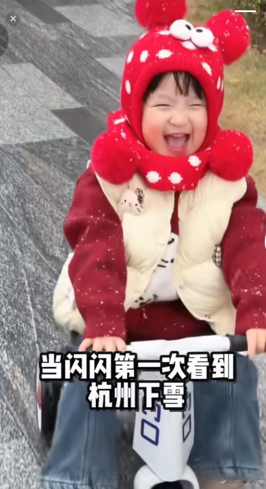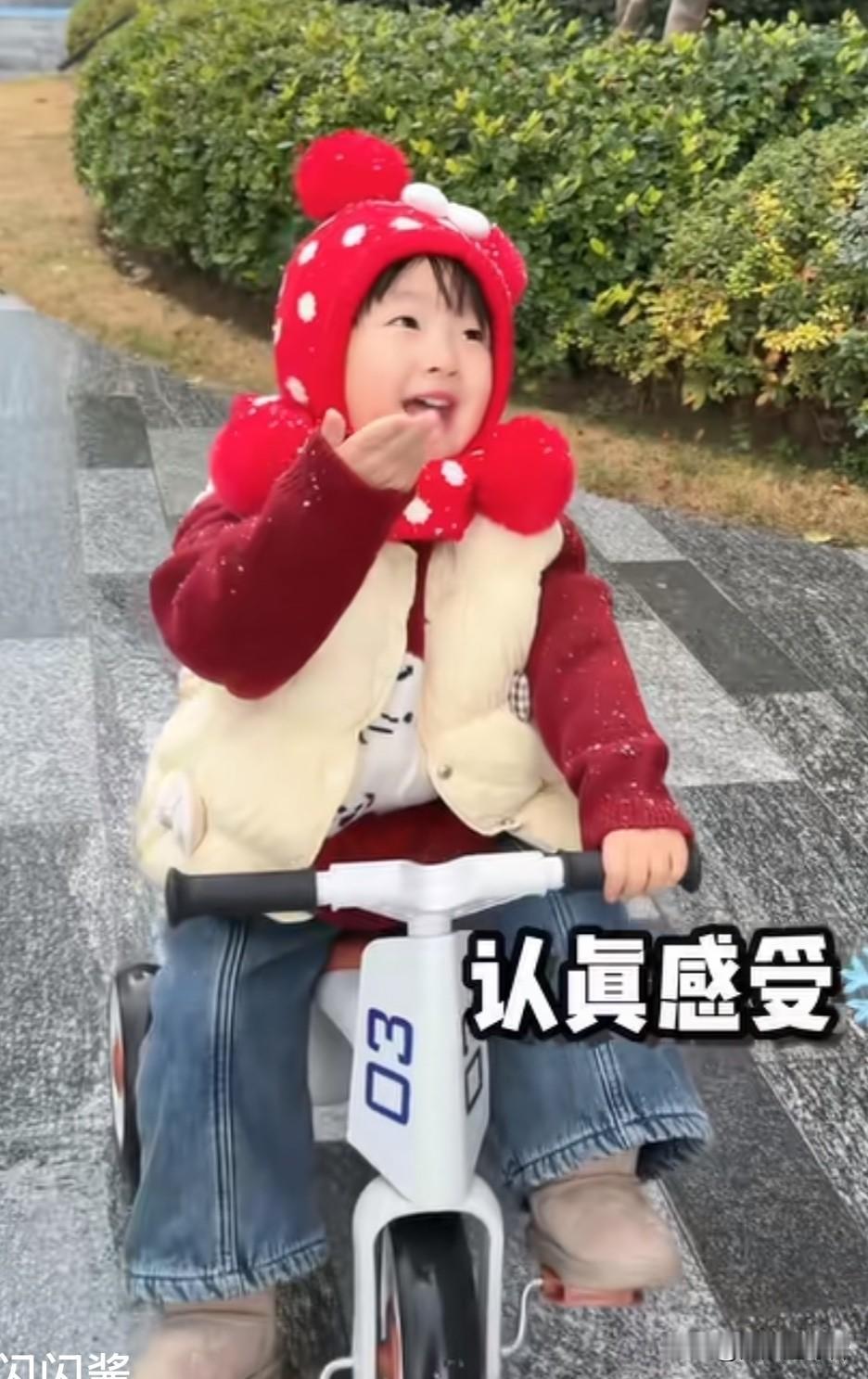 今天傍晚,黄一鸣更新了一则闪闪的视频。视频中,杭州飘起了雪,闪闪头一回见到下雪,兴奋不已。她一边骑着自己的小自行车,一边笑嘻嘻地嚷着:“下雪啦!下雪啦!我喜欢玩雪……”还伸出舌头去舔雪花。网友们看了闪闪的视频,都被机灵可爱的闪闪逗乐了。有人说,闪闪的笑声太治愈了,情绪还很稳定,实在惹人喜爱!