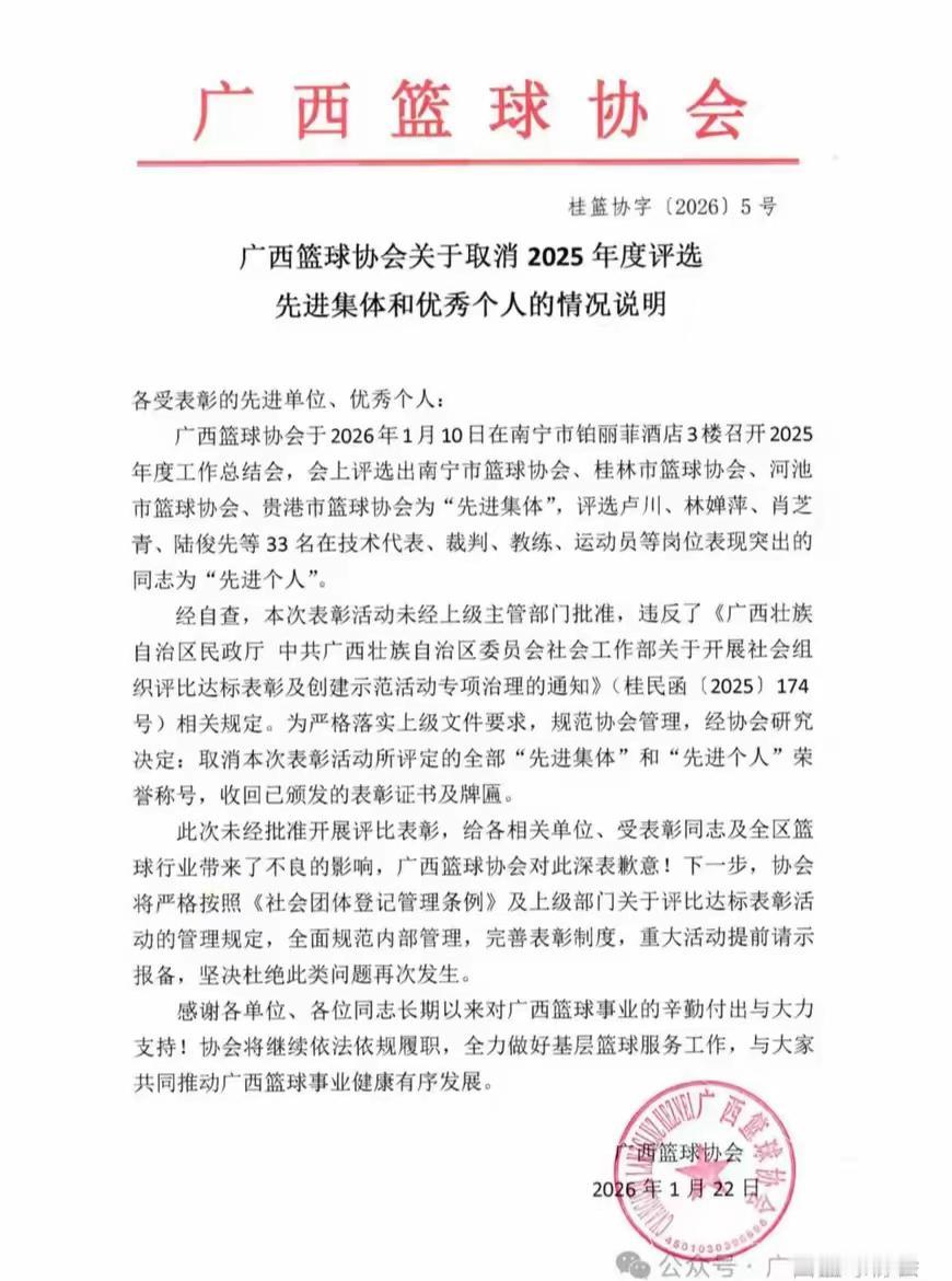 没有CBA球队的广西,广西篮协闹出了一出想不到的事。在2026年1月10日召开的2025年度工作总结会,这次总结会上的3个先进集体、33个先进个人的荣誉称号。 一月22日就发文取消荣誉,收回已颁发的表彰证书及牌匾。 真是自己打脸啪啪响, 原来是广西篮协违反了上级部门在2025年对社会组织评比达标表彰的相关要求。中国篮协 篮协罚款 宾阳篮协 东兰篮协 荔浦篮协 南丹篮协 钦北篮协