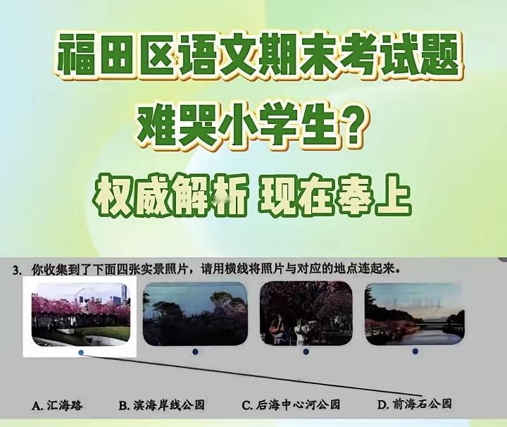 深圳市福田区小学四年级这道语文考试题又火了,不过我还是想请网友证实一下,这道城市公园的连线题,真的是福田区四年级语文期末试题吗?我觉得应该是南山区的语文期末试题吧。 要说深圳的公园和城市风景,比我熟悉的人可能不多。我骑车和徒步基本上走遍了深圳所有的城市公园,所以非常熟悉。如果是福田区的期末考试试卷,考南山区的公园连线,那真的有点难为这帮小学生了。我在想,难不成这套试卷是南山区老师出的? 福田区有很多一流的市政公园啊,大名鼎鼎的莲花山公园,红树林公园,中心公园,市民中心广场,香蜜公园,园博园,荔枝公园( 荔枝公园是福田区公园,不是罗湖区的),这么多公园还不够出一道考试题吗,非得借用南山区的市政公园。 所以我觉得网友是不是搞错了,这不应当是福田区语文的期末考试题。