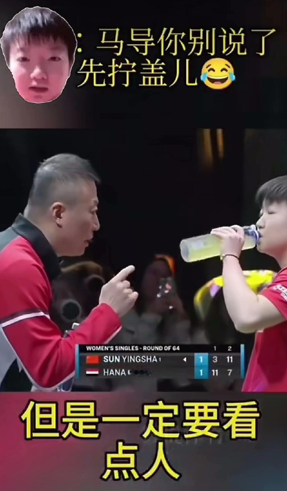 马琳懵了! 马琳对着莎莎侃侃而谈,球打的非常好,但是也要看着点人,当他退到小中台了,这球还是要憋会反手禁区。如果他站到近台,可以给到中间。 莎莎:“先拧盖吧。” 哈哈哈,莎莎这波操作把马琳都搞蒙了,说半天,莎莎仿佛再说,让我先喝口水,这些我都知道,先拧盖吧。 真是笑不活了。