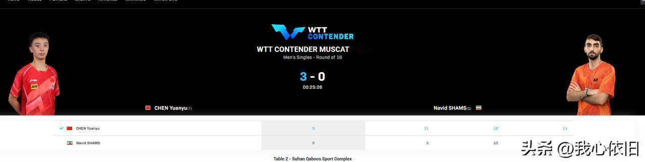 恭喜陈垣宇!3:0轻取伊朗的年轻小将沙姆斯,拿到第七个WTT马斯喀特常规挑战赛男单八强名额。 至此国乒已经出战的5名男单选手取得了3胜2负的成绩,林诗栋、温瑞博和陈垣宇晋级,黄友政与向鹏出局。目前另外一名男单队员陈俊菘与克罗地亚老将加尼奇的比赛正在进行之中。 今天这场比赛,陈垣宇赢得非常轻松。他接连11:3、12:10和11:9连赢三局后,顺利晋级。 接下来陈垣宇将会在1/4决赛中对阵瑞典名将安东卡尔伯格,而林诗栋将要对阵约奇克,温瑞博的对手将是陈俊菘和加尼奇之间的胜者。另外一场1/4决赛弗朗西斯卡对阵黄镇廷。陈垣宇