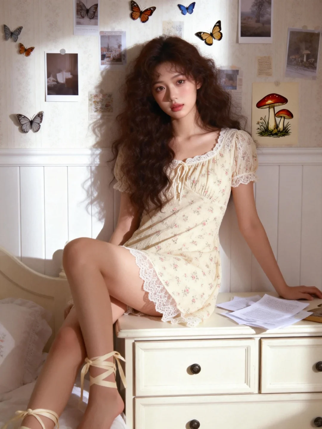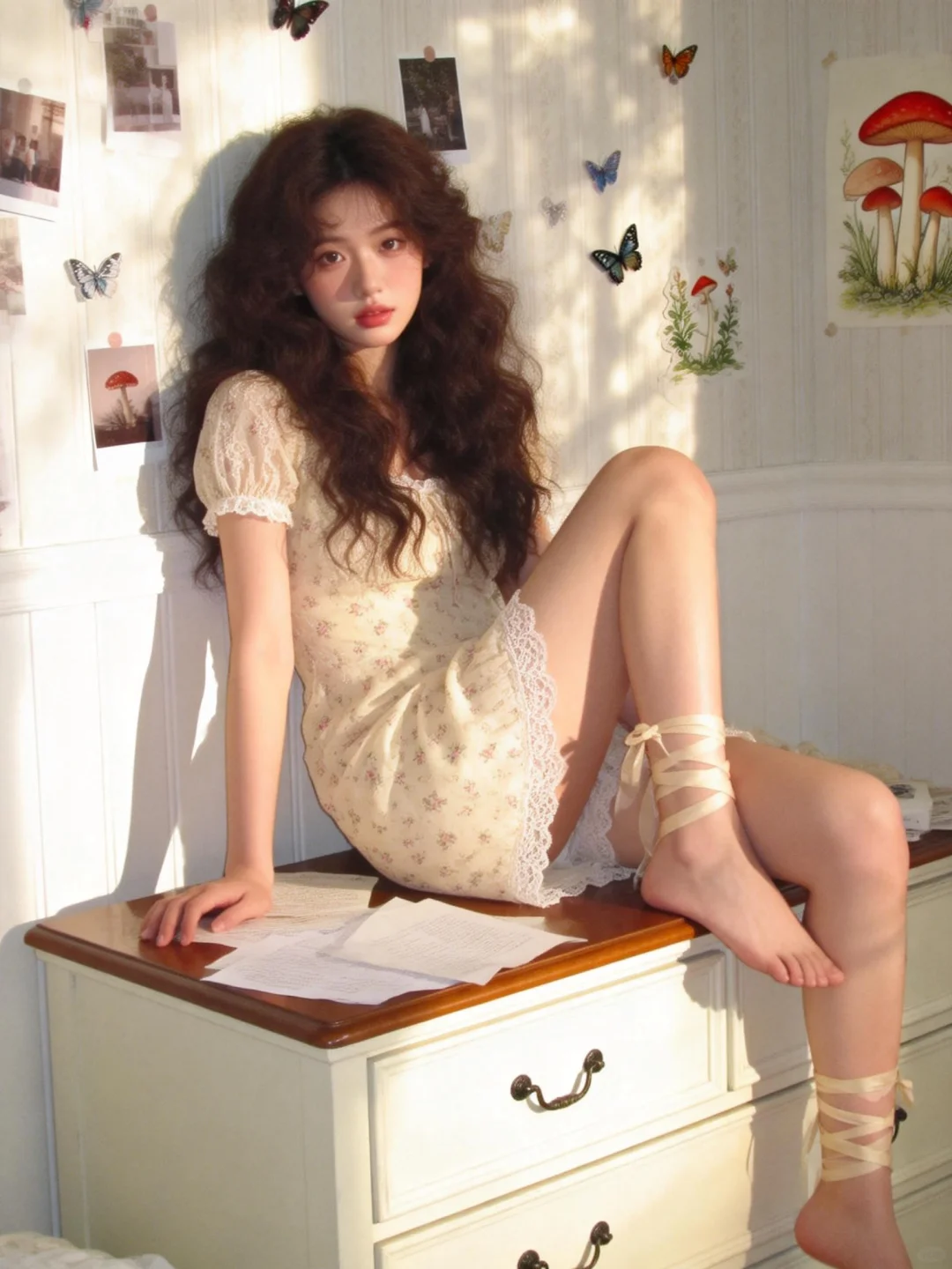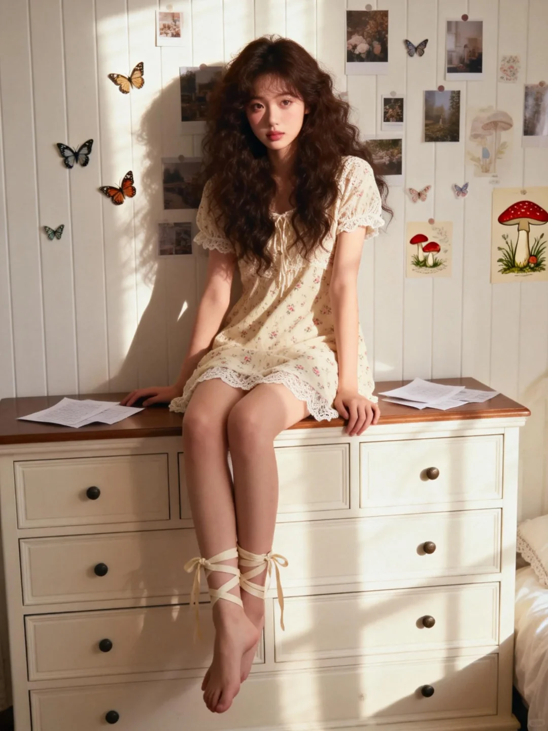 [仙女R]拍摄技巧 🌼 光线:下午 3-5 点侧逆光,阳光扫过发丝自带柔光滤镜 🪑 场景:白墙 + 旧抽屉柜,贴蝴蝶贴纸 / 拍立得就很有氛围 💃 姿势:侧身坐柜沿,脚踝绑丝带,眼神半垂更松弛 👗 穿搭:碎花蕾丝裙 + 蓬松卷发,暖光里温柔感拉满 🎨 调色:暖黄调 + 低对比 + 颗粒感,秒变胶片质感