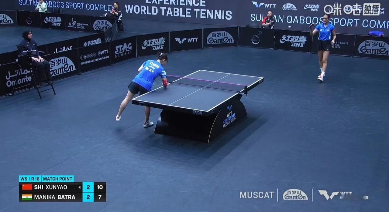 石洵瑶🇨🇳扳回两局! 前两局石洵瑶🇨🇳10-12,11-2,11-5反超巴特拉🇮🇳 ! 第二局石洵瑶6-0强势开局,最终横扫了对手,第三局石洵瑶如法炮制,又一局大比分获胜,巴特拉这是崩溃了呀。 第四局也结束了,王晓彤🇨🇳11-3安娜·赫西🏴,又要打决胜局了。 这是一场WTT常规挑战赛马斯喀特站女单1/8决赛,石洵瑶继续加油!