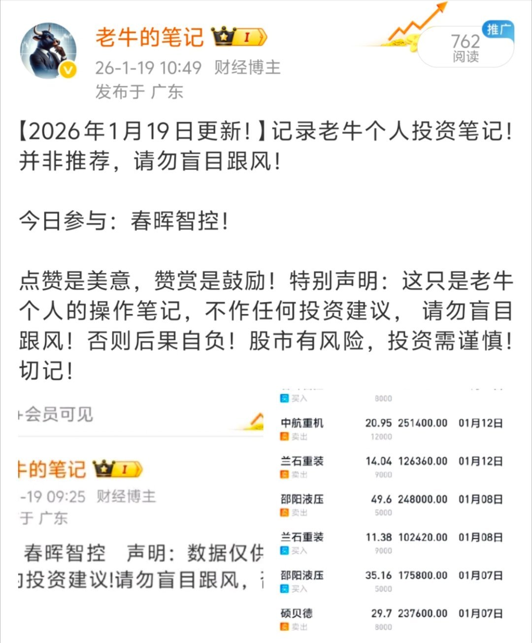 【2026年1月22日更新!】记录老牛个人投资笔记!并非推荐,请勿盲目跟风! 春晖智控!继续格局!点赞是美意,赞赏是鼓励!特别声明:这只是老牛个人的操作笔记,不作任何投资建议, 请勿盲目跟风!否则后果自负!股市有风险,投资需谨慎!切记!