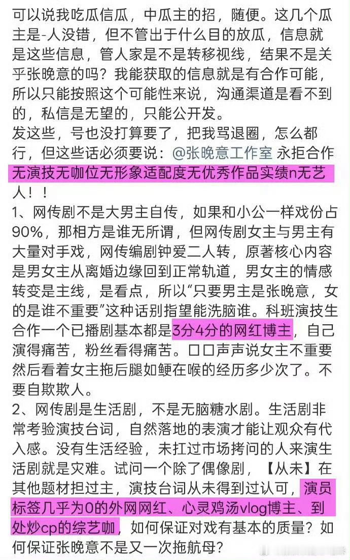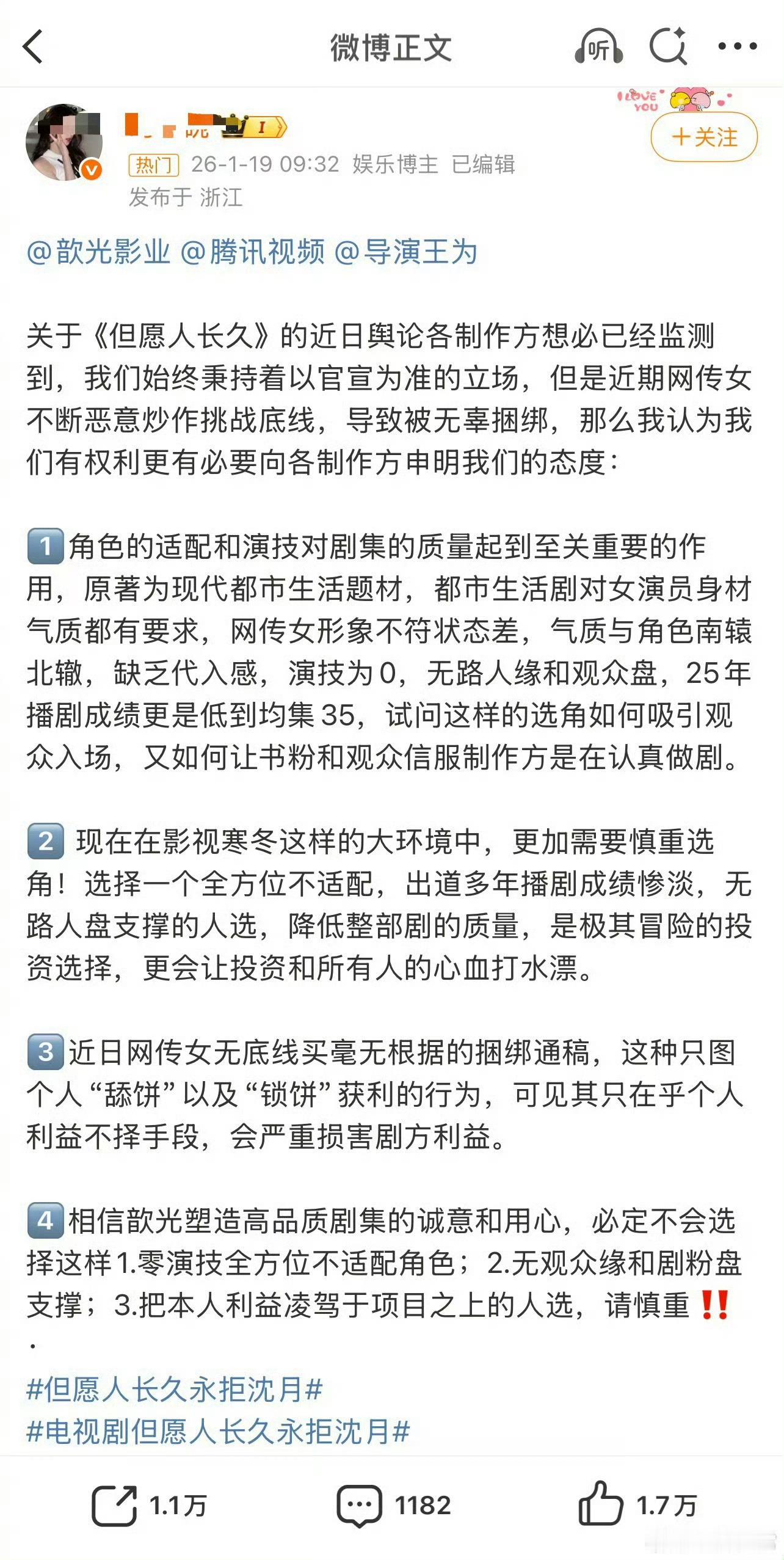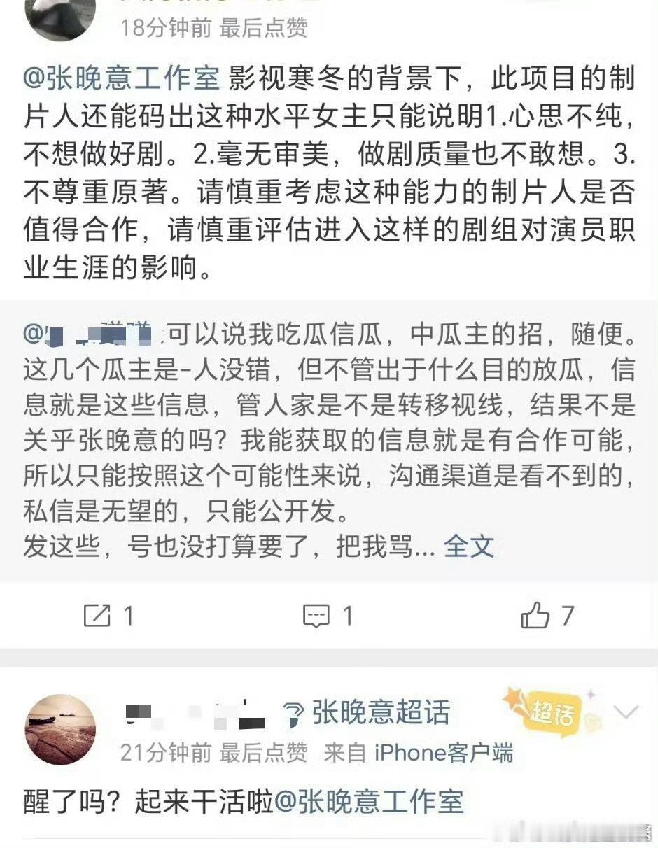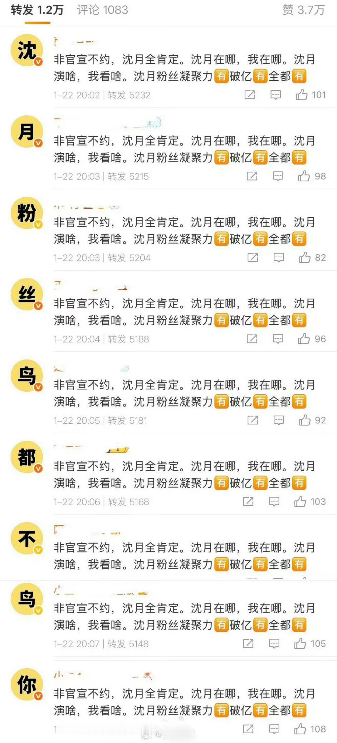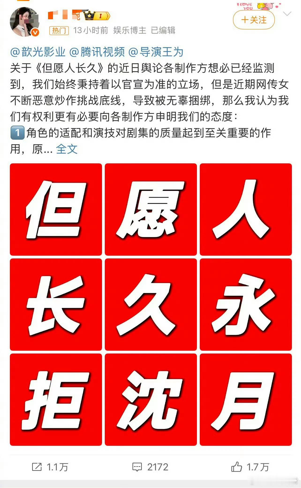 张晚意跟沈月两家还在继续啊?这都多少天了?张晚意粉丝从15日开始就永拒沈月演《但愿人长久》,如今已经破万转了 。沈月粉丝姗姗来迟,今日排字喊话“沈月粉丝鸟都不鸟你” 嗯,还是比较文明了,一般排字都是骂人,但是沈月家还好。就是气势上面没有张晚意家那么足。流量上确实是张晚意家比较大。