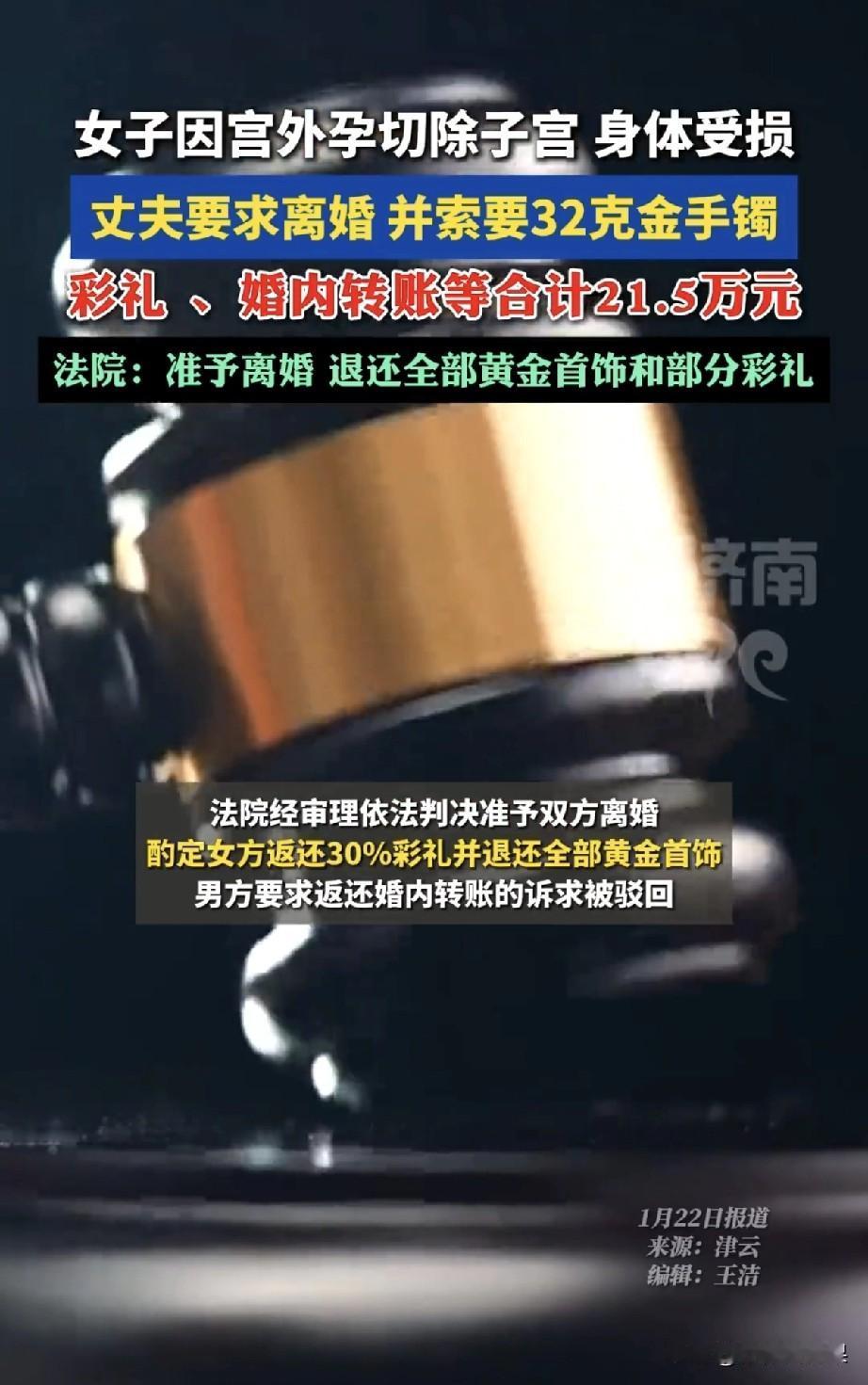 真没见过这么绝情冷血的婆家,姑娘为了给婆家生孩子,宫外孕大出血,切掉了输卵管和部分子宫,这辈子都当不了妈了,这是拿半条命在付出啊!结果呢?老公转头就提离婚还要女子把彩礼和金手镯全部要回来。 最让人痛心的是法院居然还判了返还30%彩礼和全部黄金首饰!那我就想问问:这姑娘的健康、生育权、身体损伤,谁来赔?谁给她算这笔账? 这哪是离婚,分明是把人榨干价值后再踹出门,连最后一点念想都要抢走!这种婆家,真是坏到骨头里了!姑娘太可怜了,用一辈子的幸福,换来了这么个狼心狗肺的结局!