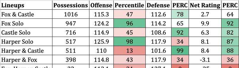 1. 进攻表现 - 仅哈珀:进攻效率125.9,进攻百分位98,是所有阵容里最强进攻表现。 - 仅福克斯:进攻效率124.2,进攻百分位96,同样是顶级进攻表现。 - 福克斯+卡斯尔:进攻效率115.3,进攻百分位47,表现仅为联盟平均水平。 - 哈珀+卡斯尔:进攻效率110,进攻百分位13,是最差的进攻组合。 2. 防守表现 - 仅卡斯尔:防守效率108.6,防守百分位92,是所有阵容里最强的防守组合。 - 仅福克斯:防守效率114.2,防守百分位65,防守表现处于联盟中上水平。 - 福克斯、哈珀、卡斯尔三人同场:防守效率137.1,防守百分位0,是最差的防守组合。 - 仅哈珀:防守效率117.9,防守百分位34,防守表现处于联盟中下游水平。 3. 净效率 - 哈珀+卡斯尔:净效率+8.4,净效率百分位88,是所有阵容里综合表现最好的组合。 - 仅福克斯:净效率+6.9,净效率百分位92,攻防两端都很均衡。 - 福克斯、哈珀、卡斯尔三人同场:净效率-25,净效率百分位0,是综合表现最差的组合。 - 哈珀+福克斯:净效率-3.1,净效率百分位36,是唯一净效率为负的双人组。 结论: - 小样本下三人同场效果极差:当福克斯、哈珀、卡斯尔同时在场时,攻防两端都是灾难级表现,是绝对需要避免的阵容。 - 卡斯尔的防守价值:卡斯尔单独在场时防守极强,和哈珀搭档时也能打出高净效率,说明他的防守对阵容增益明显。 - 哈珀的进攻价值:哈珀单独在场时进攻效率惊人,但和卡斯尔搭档时进攻效率骤降,说明两人的进攻兼容性不佳。 - 福克斯的全能性:福克斯单独在场时攻防俱佳,是最稳定的核心阵容。