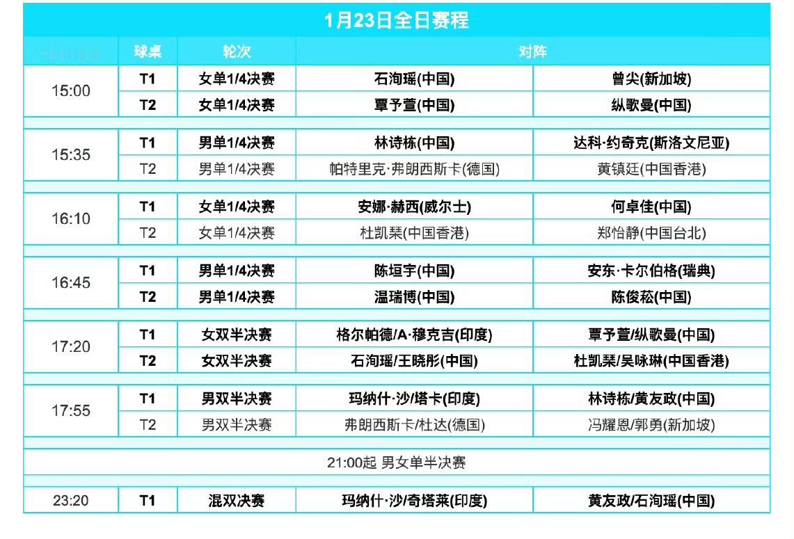 今天焦点战—— 温瑞博🇨🇳VS陈俊菘🇨🇳! 2026WTT常规挑战赛马斯喀特站今日(1月23日,周五)全日赛程如下图。 手心手背都是肉,国乒今天有两场内战,除了上面说的小温和陈俊菘的内战,还有覃予萱和纵歌曼的内战,都加油吧。 另外林诗栋迎战达科🇸🇮、陈垣宇挑战安东卡尔伯格🇸🇪又是两场尤其值得关注的外战。 今日还将进行男女单打半决赛,石洵瑶今天一天三赛,也有可能是一天四赛。 (感谢草莓老师的图片)