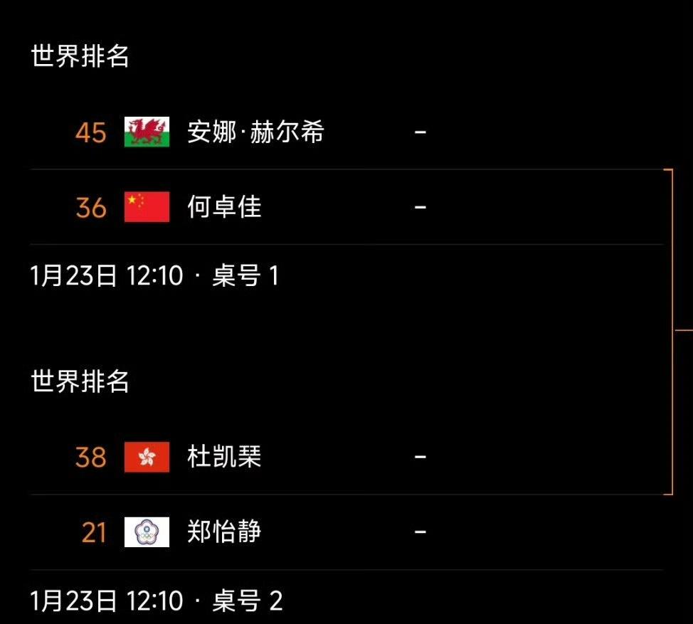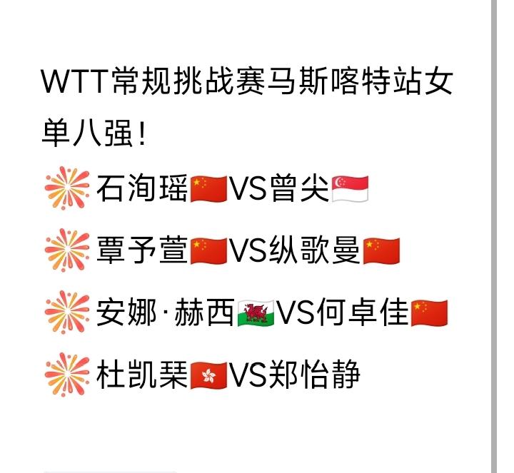 国乒女队占据四席[赞]! 昨夜2026WTT常规挑战赛马斯喀特站女单八强出炉,如图所示。 国乒🇨🇳选手占据四席,比较遗憾的是上半区挤了三人,下半区仅有何卓佳一人。 另外新加坡队🇸🇬、威尔士队🏴、中国香港队🇭🇰、中国台北队各有一人,可以说这四个人都有中国血统,因为安娜·赫西🏴的母亲是中国人[捂脸]。 期待国乒能有三人晋级四强[奋斗]!