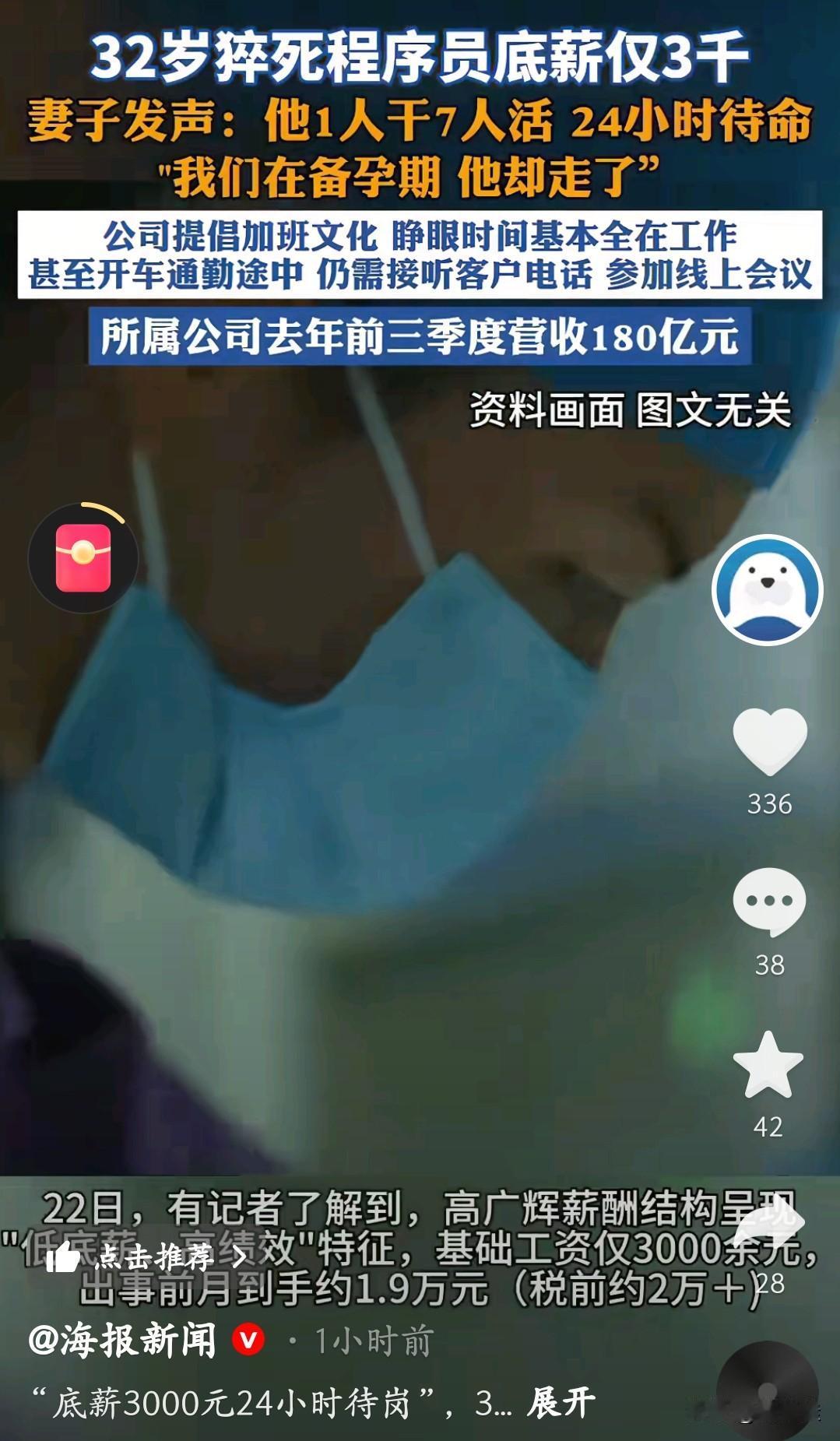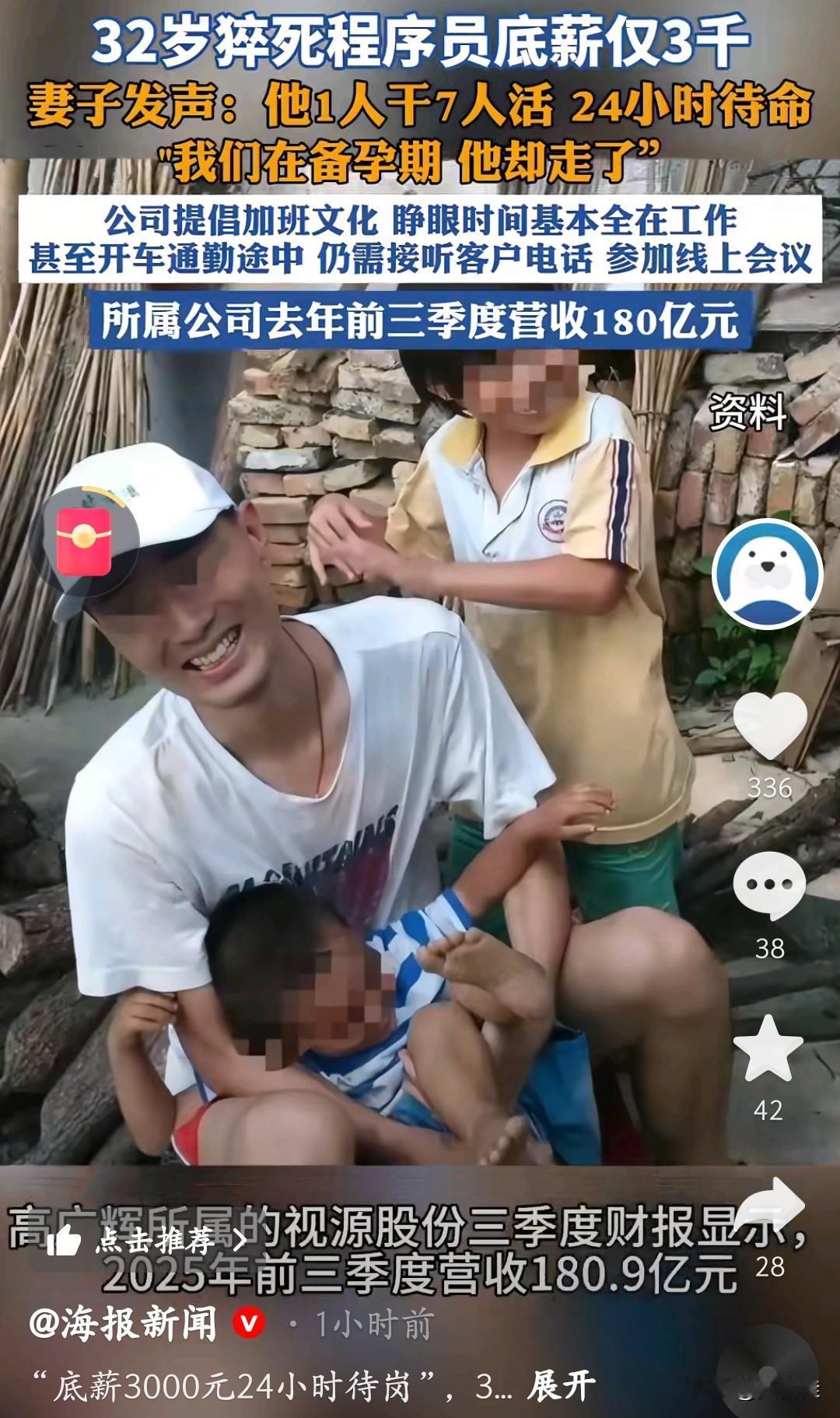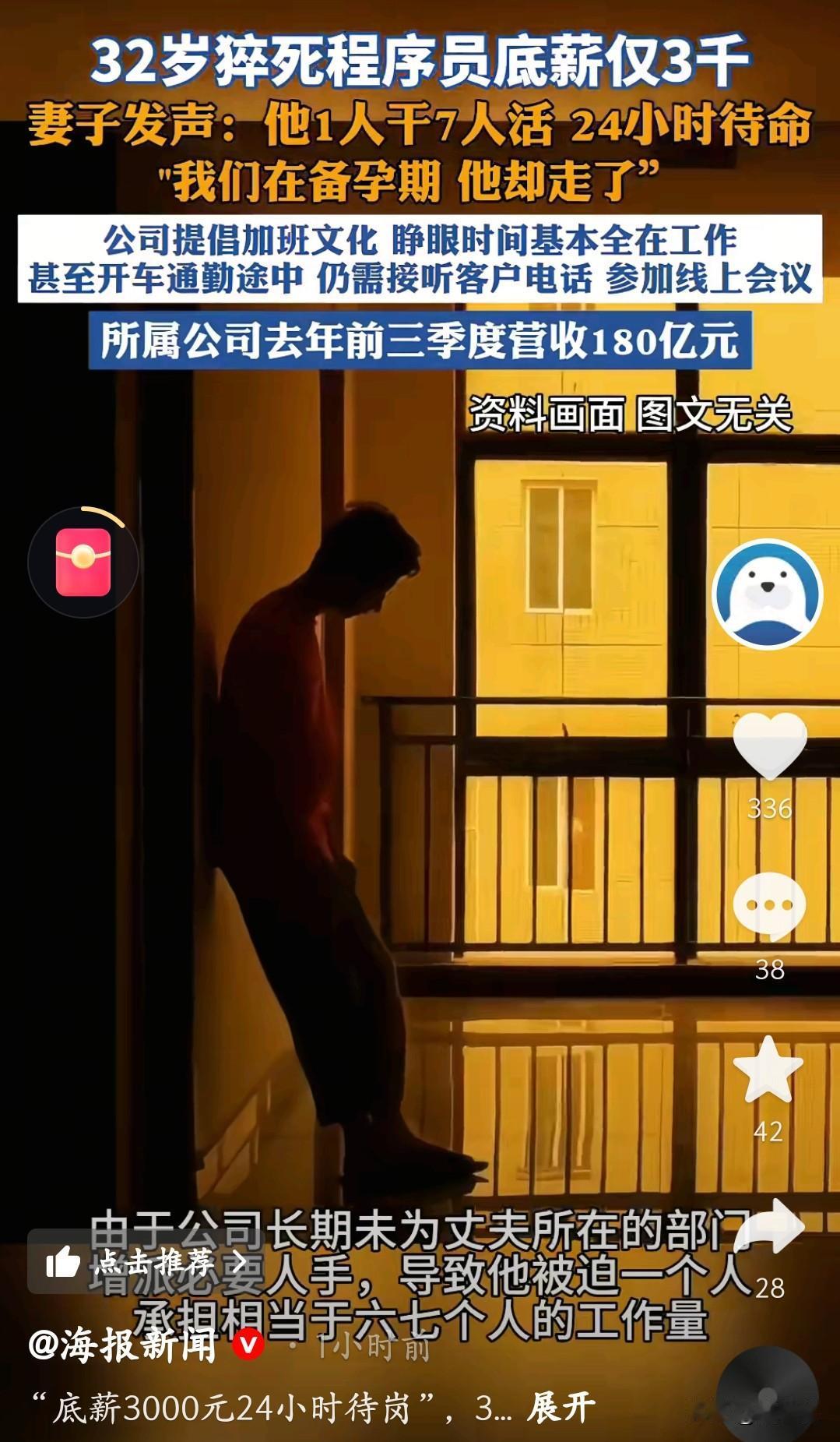 32岁猝死程序员底薪才3000元!一个人干着六七个人的活,24小时随时待命,连开车通勤都要接客户电话、开线上会议。公司前三个季度营收180亿,可他拿着“低底薪、高绩效”的工资,出事前一个月到手也才不到两万,却要拿命去换。 妻子说他们还在备孕期,丈夫就这么走了。从“几分钟回消息”到“上午发的消息下午才回”,工作一点点吞噬了他的生活,也压垮了他的身体。 公司赚得盆满钵满,代价却是一个年轻人的生命和一个家庭的破碎。我们拼命工作是为了更好的生活,可千万别让生活只剩下工作。