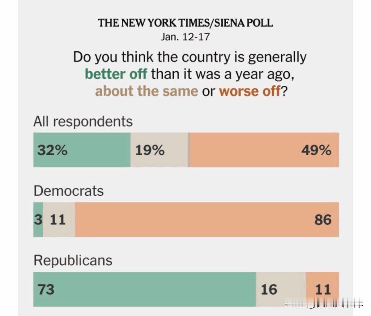 川普上任一周年之际,《纽约时报》就“现状与一年前相比如何”做了调查。 问题:你觉得美国现在的整体状况比一年前更好、差不多,还是更糟? 全部受访者 更好:32 % 差不多:19 % 更糟:49 % 民主党人 更好:3 % 差不多:11 % 更糟:86 % 共和党人 更好:73 % 差不多:16 % 更糟:11 %