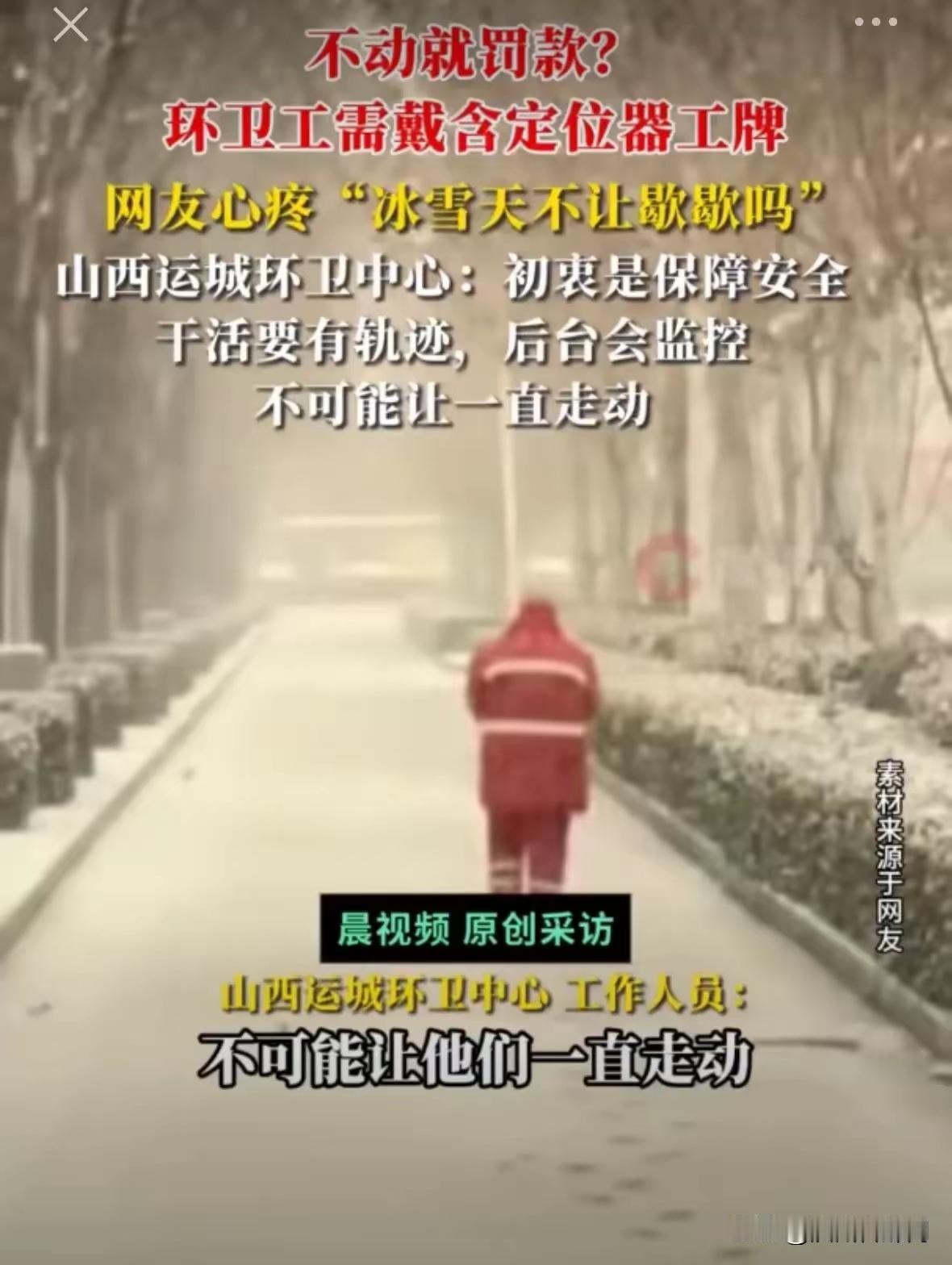 真是太“有心了”!山西环卫工人被曝佩戴定位器,工作人员:初衷是保障安全,干活要有轨迹,后台有监控,不存在一不动就罚款。 结果环卫工人下着大雪都得继续清扫。 美其名曰为了环卫工人安全,其实就是是监控,这么大费周章,🈶给环卫工人买五险一金吗?有多少工资呢? 国内的私有资本,剥削压榨员工,真是花样百出,可恶至极,真是罄竹难书,绝对不能私有化太多,势必会影响到社会稳定因素。