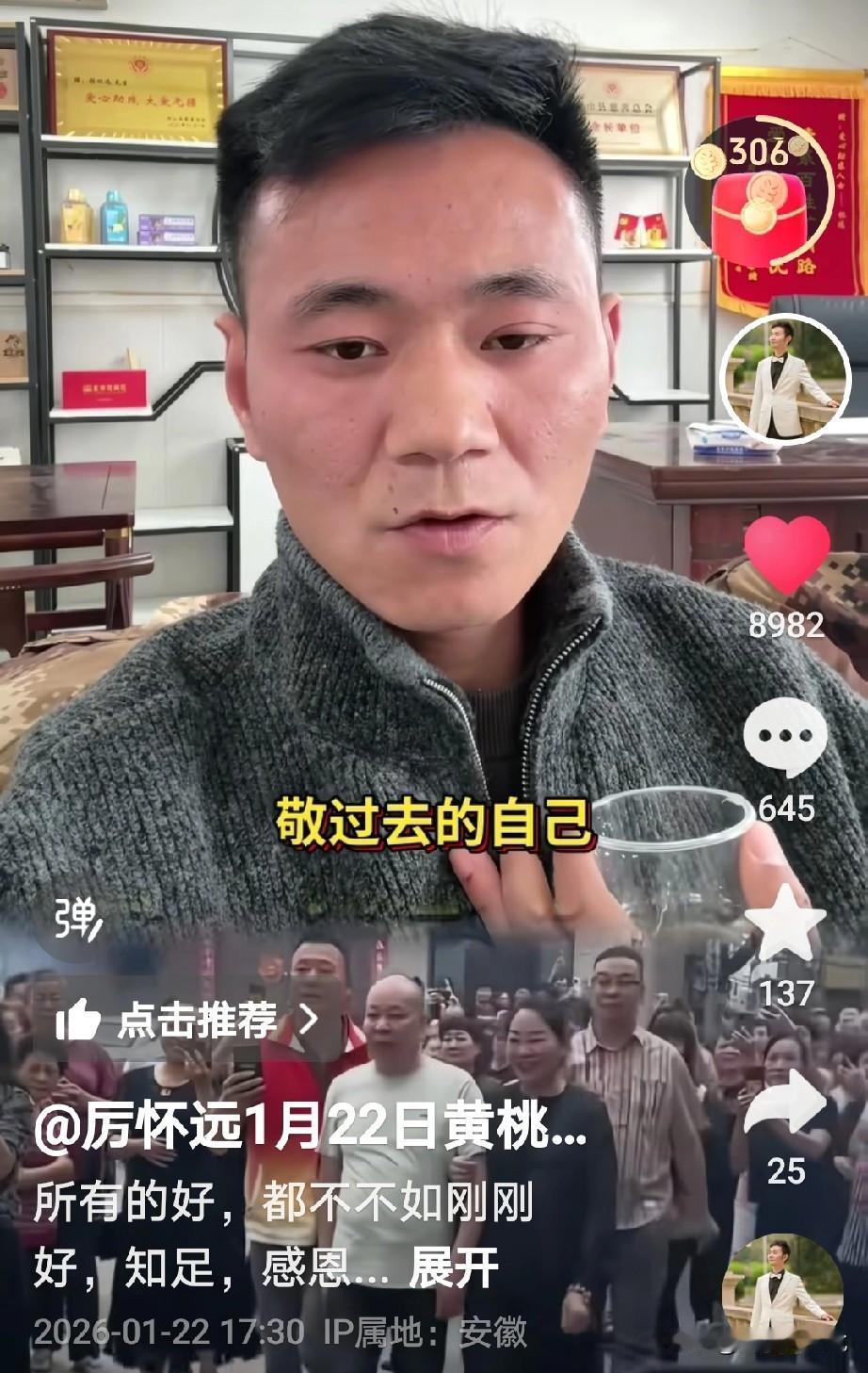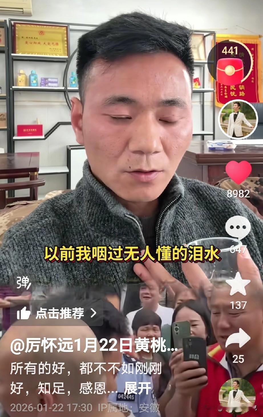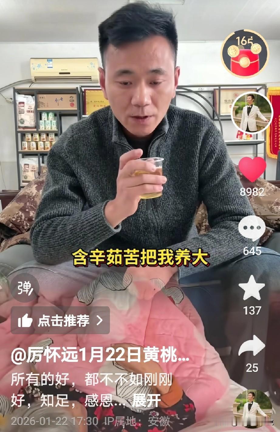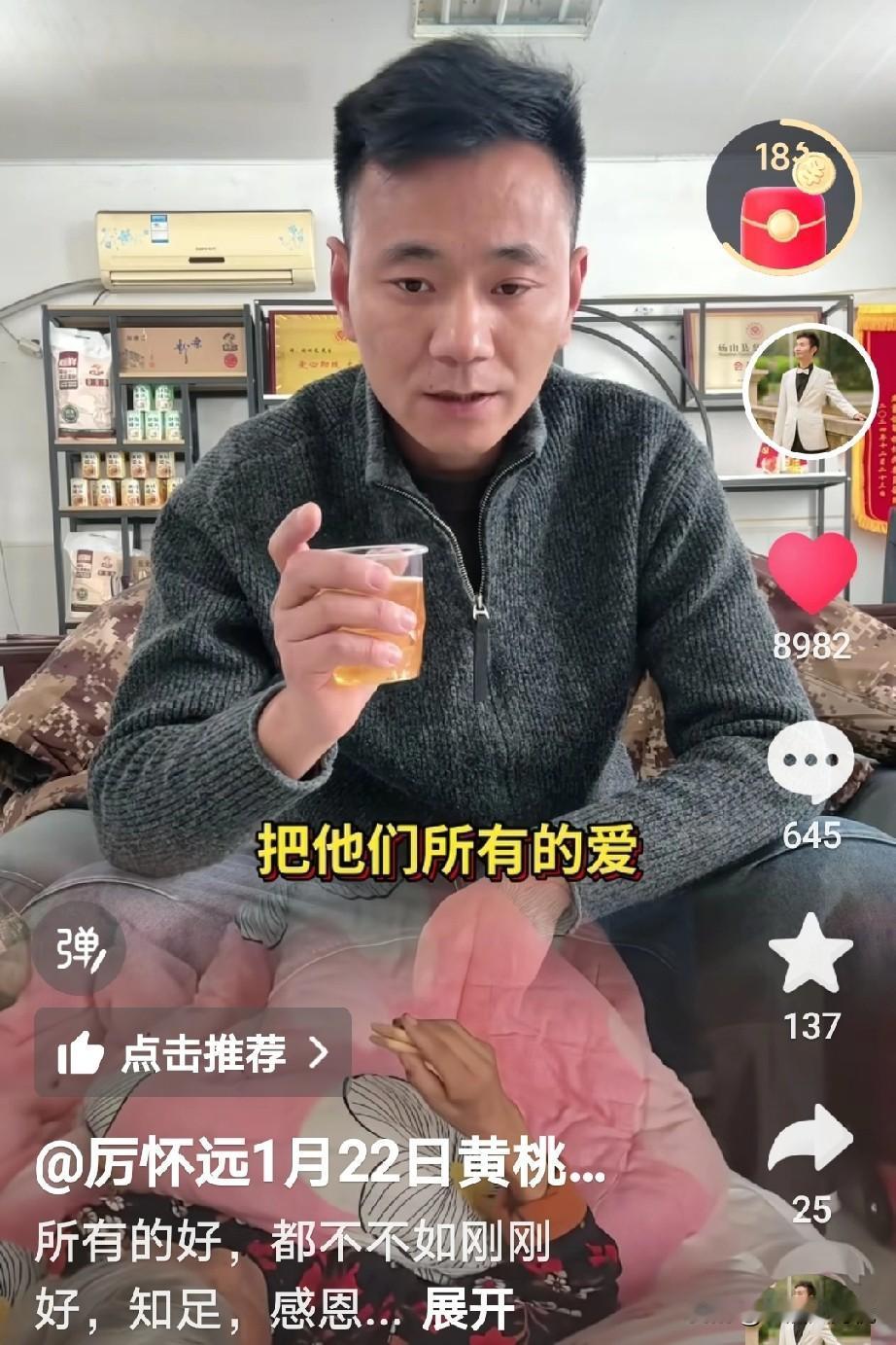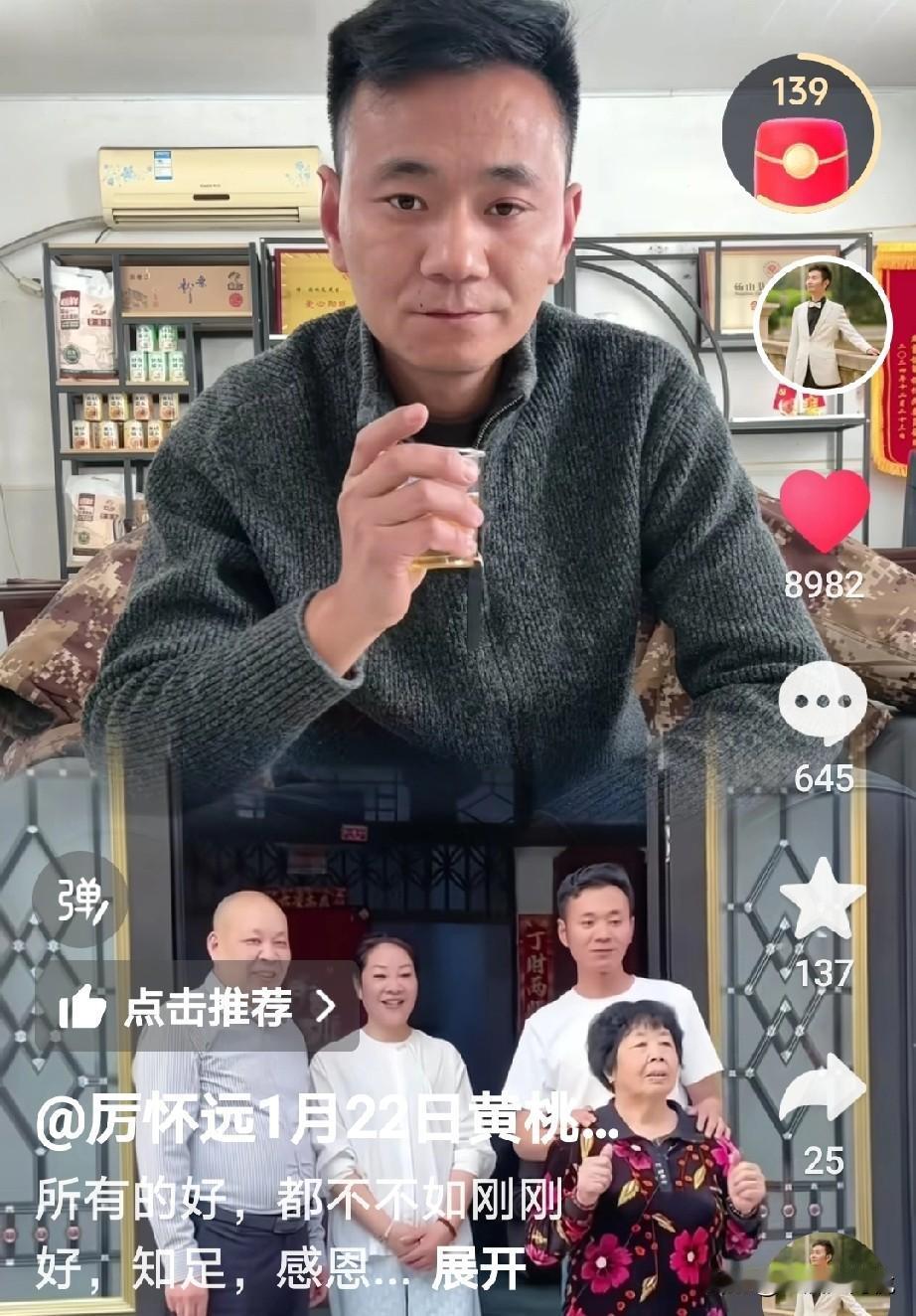 厉怀远自始至终都是把养父母放在第一位, 这样心怀感恩的心是对的,毕竟是他们从小把自己养大的, 刚刚看到厉怀远更新一个视频,视频里是厉怀远独自一人喝酒,他说首先8+1的第一杯酒是敬自己的养父母,是把们把我养大,而且还没有吃任何苦, 第二杯8+1是敬自己的亲生父母,回家了以后,是他们给了他底气,勇气,和无限的比, 第三杯8+1是敬自己的朋友,朋友也没有少帮忙, 最后一杯8+1是敬过去的自己,咽过无人懂得泪水,扛过无人能懂得的累,累的快撑不住的时候,我没有后退。从此我百毒不侵,步步生威 看到这里有网友说,就不该老提及养家, 一方面说没吃苦,一方面又说咽了好多泪水,扛了好多累[捂脸],希望你们夫妻和睦,齐心协力 我觉得尊重孩子的内心想法,他想养父母也是正常,毕竟从小把他养大也是有感情的, 这也是他真实的内心感受,像他们说的先敬生父母就假了,这孩子实诚,喝的小脸通红,大家怎么说呢?