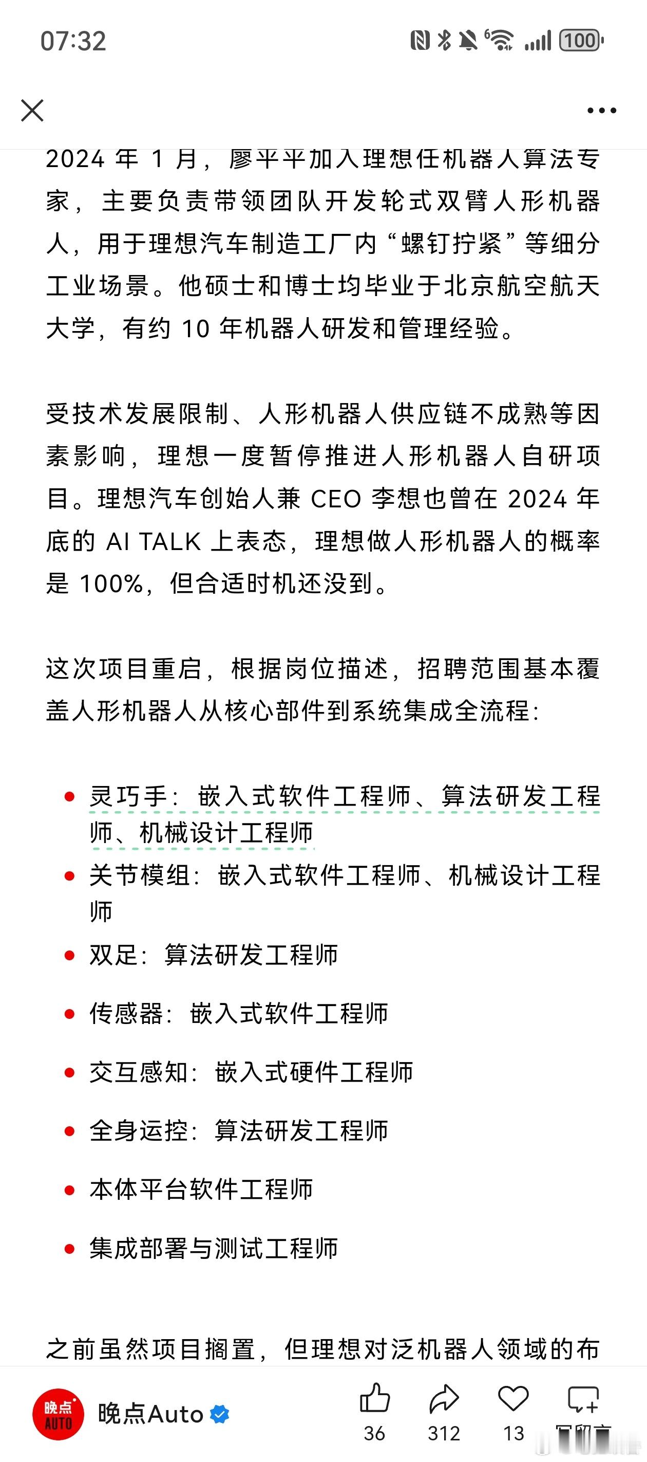 理想汽车在官网社招页面释放若干人形机器人研发岗位,重启具身机器人研发。这次项目重启,根据岗位描述,招聘范围基本覆盖人形机器人从核心部件到系统集成全流程:灵巧手:嵌入式软件工程师、算法研发工程师、机械设计工程师关节模组:嵌入式软件工程师、机械设计工程师双足:算法研发工程师传感器:嵌入式软件工程师交互感知:嵌入式硬件工程师全身运控:算法研发工程师本体平台软件工程师集成部署与测试工程师理想汽车