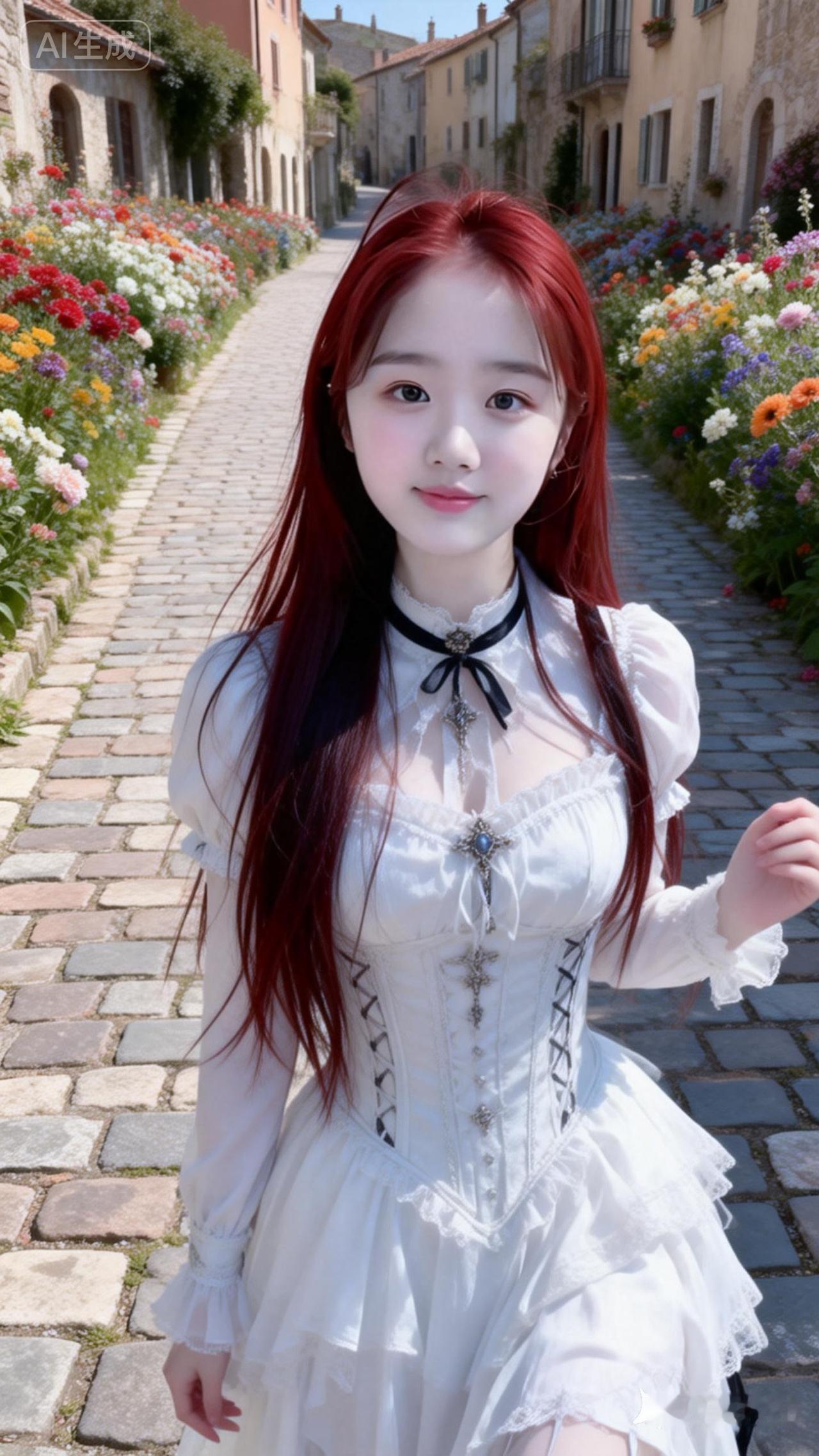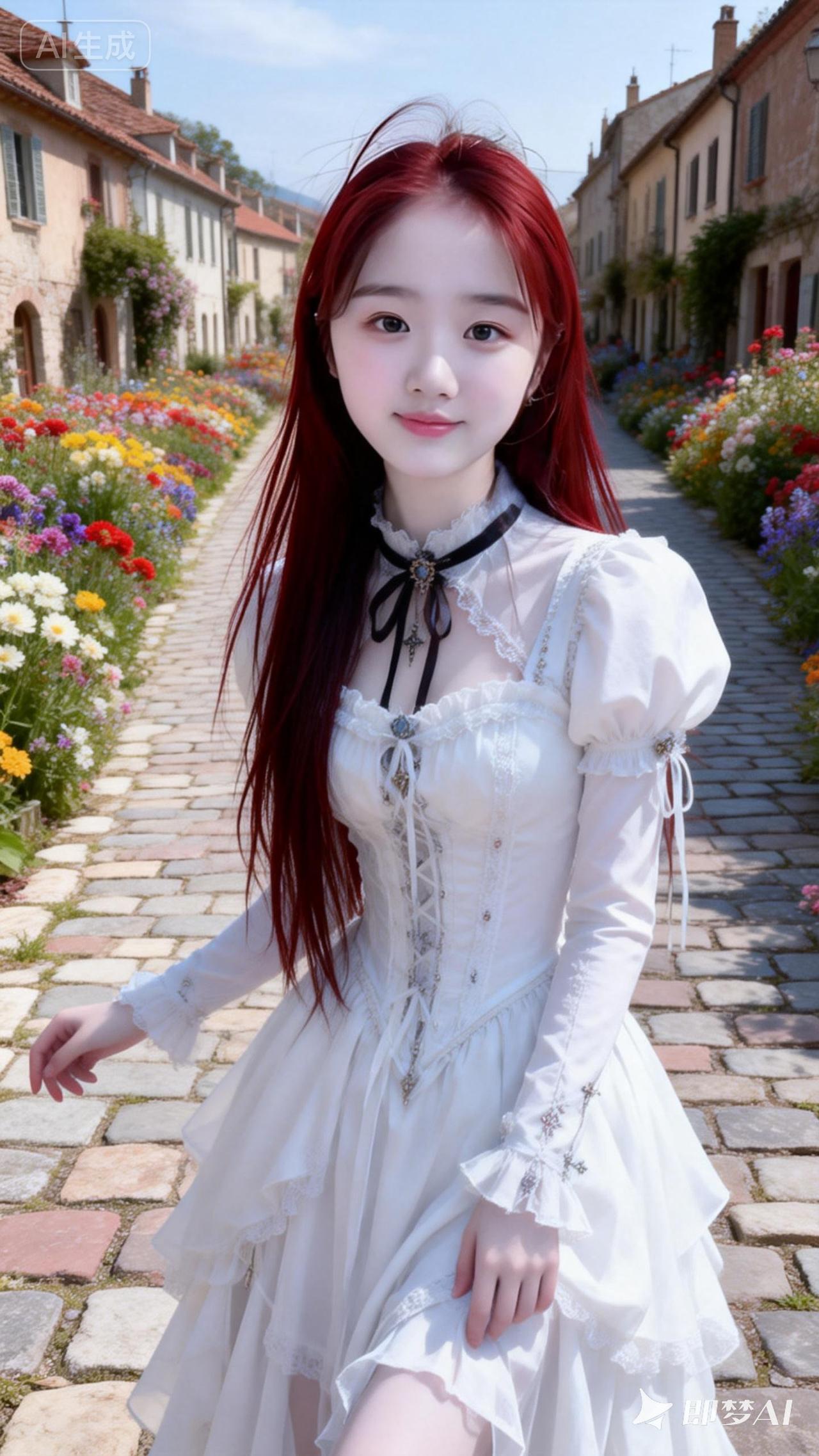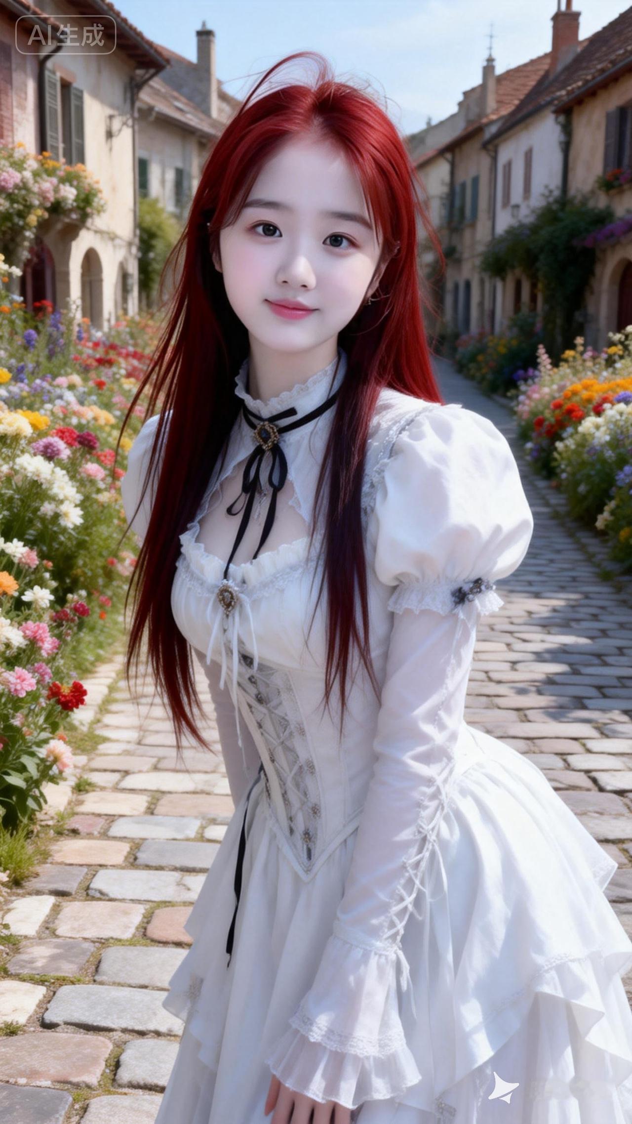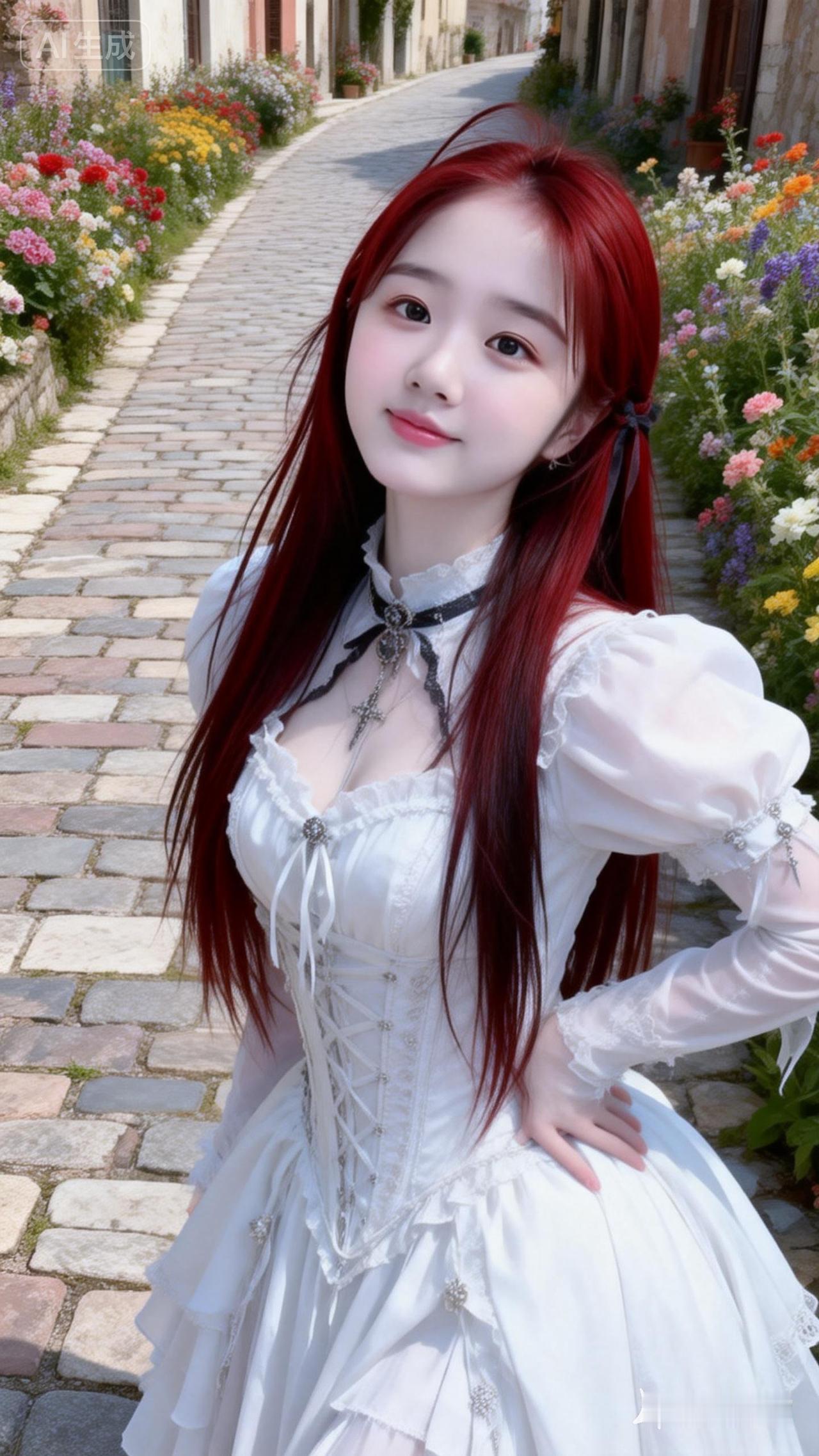 表情可爱红长直深色长发系带束缚,年轻娇小,发丝呈现出自然的蓬松感与垂坠感,长发散落于肩头两侧,几缕发丝拂面,冷白皮气质美女