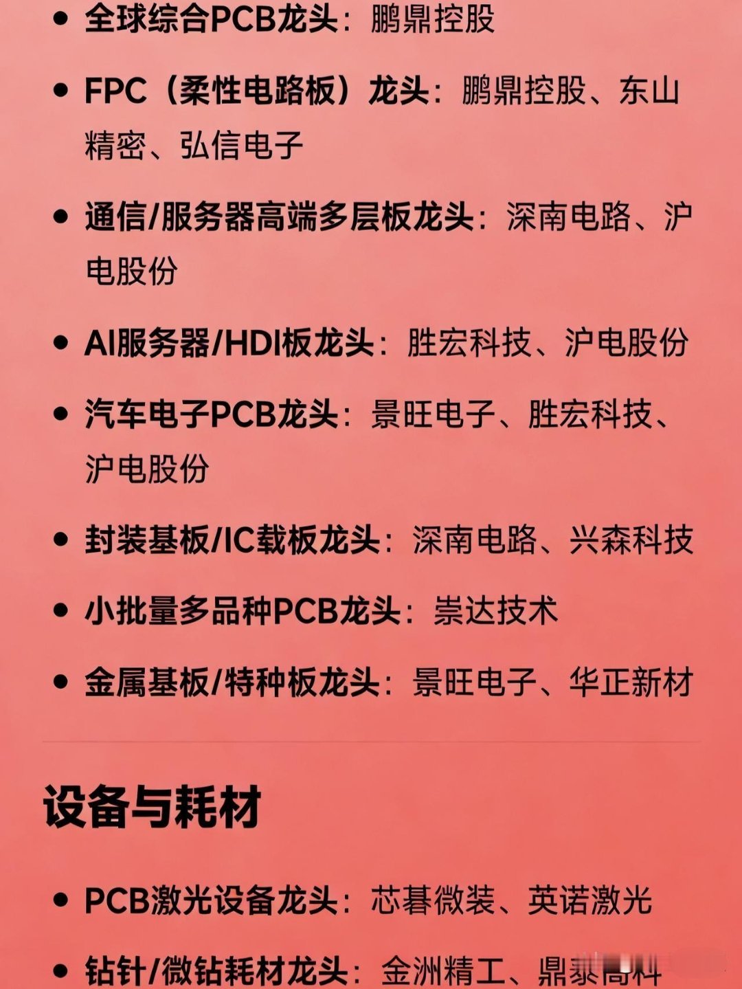 PCB产业链各环节的龙头公司分类汇总:上游材料覆铜板(CCL)龙头:生益科技、建滔积层板、华正新材、南亚新材铜箔龙头:嘉元科技、中一科技玻纤布龙头:中国巨石、泰山玻纤电子化学品(干膜/油墨)龙头:飞凯材料、容大感光中游制造按产品/技术类型:全球综合PCB龙头:鹏鼎控股FPC(柔性电路板)龙头:鹏鼎控股、东山精密、弘信电子通信/服务器高端多层板龙头:深南电路、沪电股份AI服务器/HDI板龙头:胜宏科技、沪电股份汽车电子PCB龙头:景旺电子、胜宏科技、沪电股份封装基板/IC载板龙头:深南电路、兴森科技小批量多品种PCB龙头:崇达技术金属基板/特种板龙头:景旺电子、华正新材设备与耗材PCB激光设备龙头:芯碁微装、英诺激光钻针/微钻耗材龙头:金洲精工、鼎泰高科