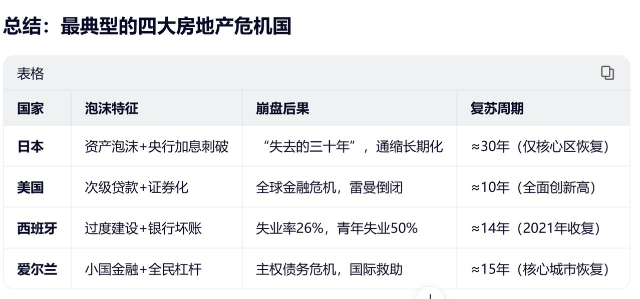 无论用多久,房价最终都会涨回去, 而且会比之前高,各国都是如此。 穿越周期,你就是大赢家。 日本东京房地产泡沫用时最长, 整个周期一共约30年: 下跌20年,涨回原价用了10年。 之后至今连涨5年, 现在比最高峰时上涨80%。 西班牙房地产危机, 整个周期一共约14年: 下跌6年,涨回原价用了8年; 之后至今连涨3年, 现在比最高峰上涨35%。 美国次贷危机用时较短, 整个周期一共约10年: 下跌5年,涨回原价用了5年。 之后至今连涨10年, 现在比最高峰上涨124%。 中国会是哪一类呢? 但无论是哪一类, 房价最终都会涨回原价, 也会比之前泡沫最高峰还高。 所以, 如果你有能力, 一定不要贱卖你的房子, 穿越周期, 自然会春暖花开, 你就是大赢家。 仅限于人口持续流入的一二线城市。 大家怎么看呢?
