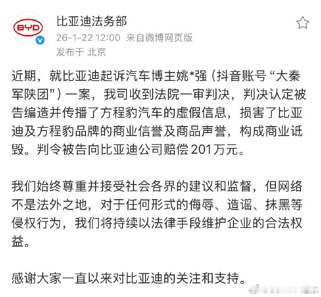 搞黑媒体黑公关之前,先问问自己有没有200万比亚迪胜诉姚十八,被判201万,在他之上有201.87万的龙猪,在它之下有200万的龙哥(龙啥的都和比亚迪有仇吗)姚十八这波合订本真是搞笑了,“完全没有抹黑方程豹,还要主动起诉比亚迪”,啪一下,赔200万肯定还会有下一个200万,但我希望别有了,赚的黑心钱最终又都赔出去了,还不利于中国汽车发展,损人不利己,何必呢?所以,大家一定要:抵制黑公关还网络一片净土!并且比亚迪李云飞也说了,对比亚迪的批评监督都是可以的,并不是说比亚迪的负面一点都不能说,但一定要基于事实,诚实、正直、不说假话方程豹胜诉姚十八汽车资讯大v聊车