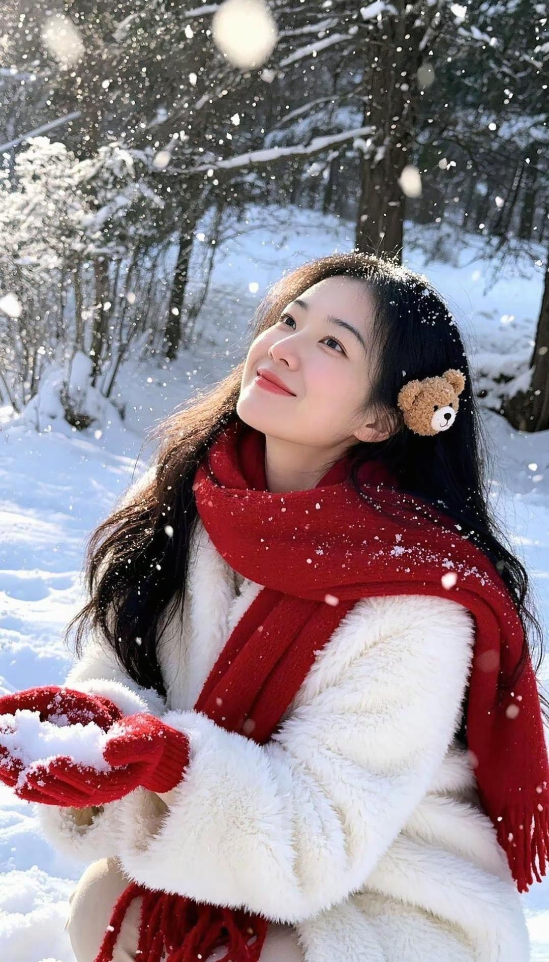 冬日暖阳下,雪地里的少女与熊耳朵发夹的可爱瞬间
